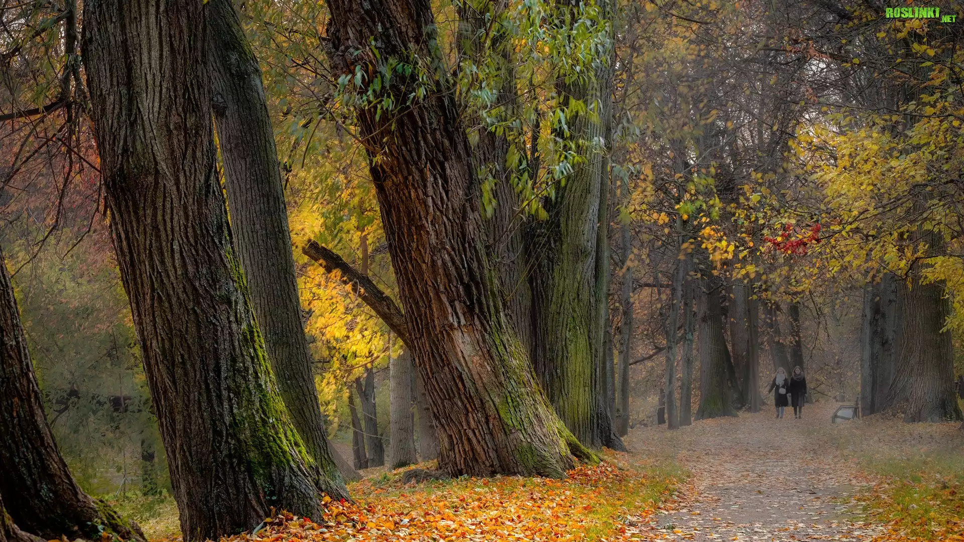 Rośliny: Jesień, Park, Kobiety, Alejka, Drzewa, Ławka, Liście