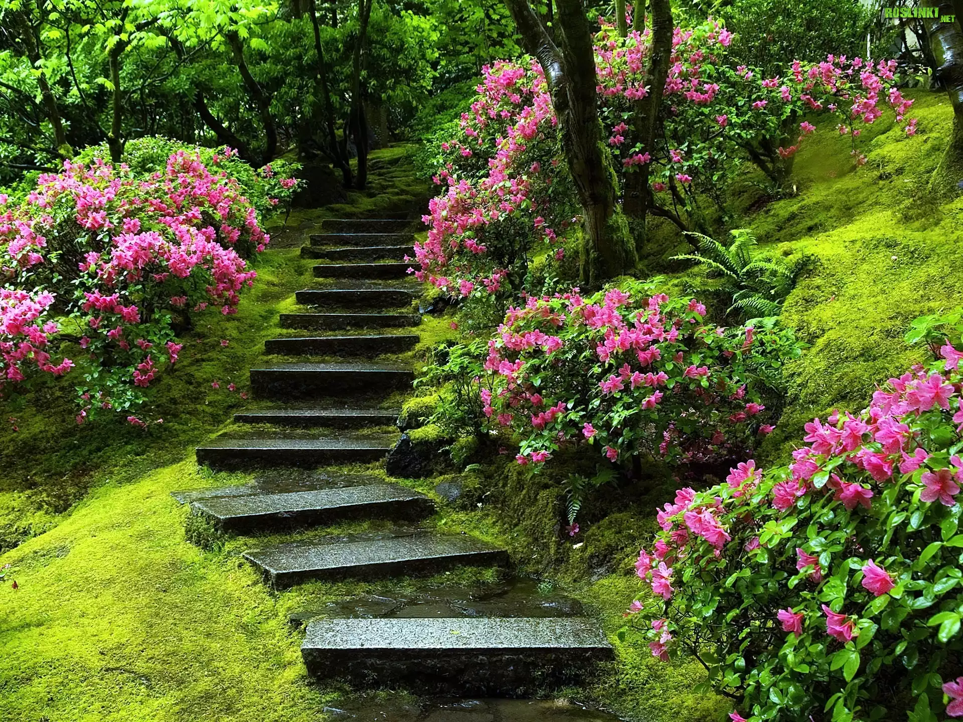 Rośliny: Park, Kwitnące, Rododendrony, Kamienne, Schodki