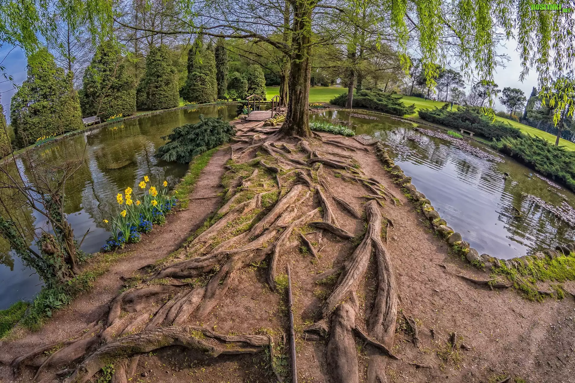 Rośliny: Park, Wiosna, Drzewa, Korzenie, Staw