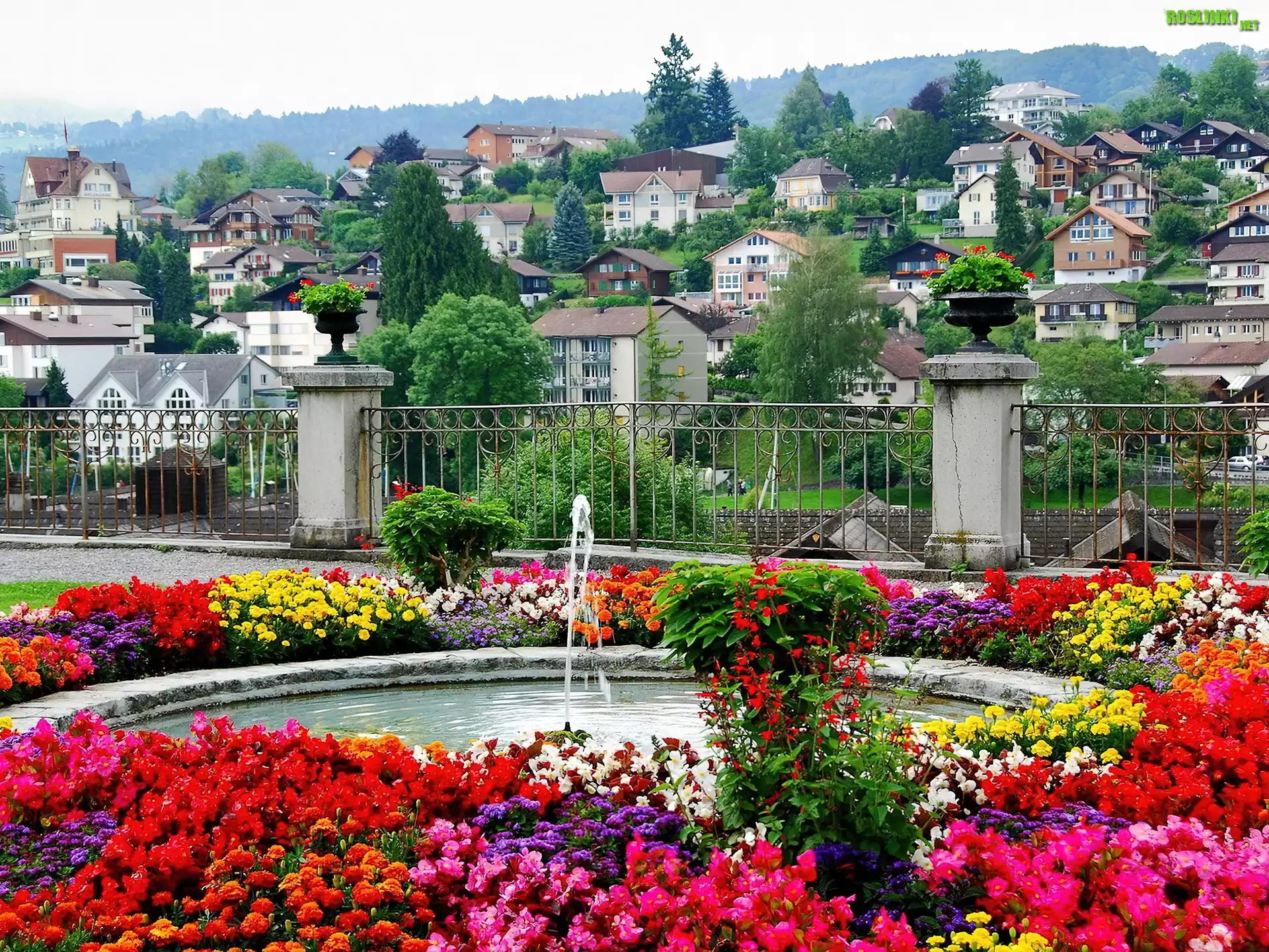 Rośliny: Park, Fontanna, Otoczona, Kwiatami, Miejscowość