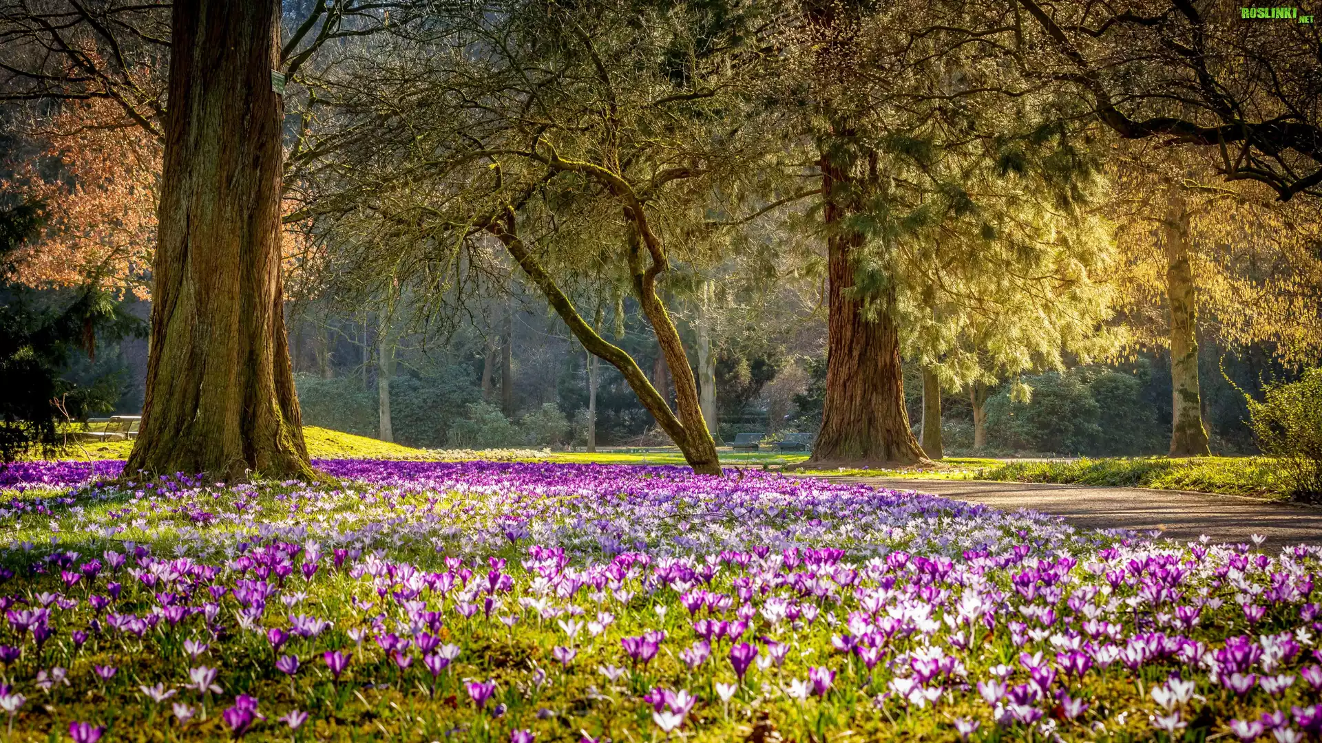 Rośliny: Park, Wiosna, Drzewa, Kwiaty, Krokusy