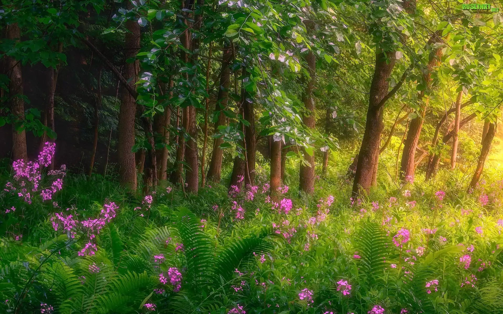Rośliny: Park, Drzewa, Różowe, Kwiaty, Paprocie