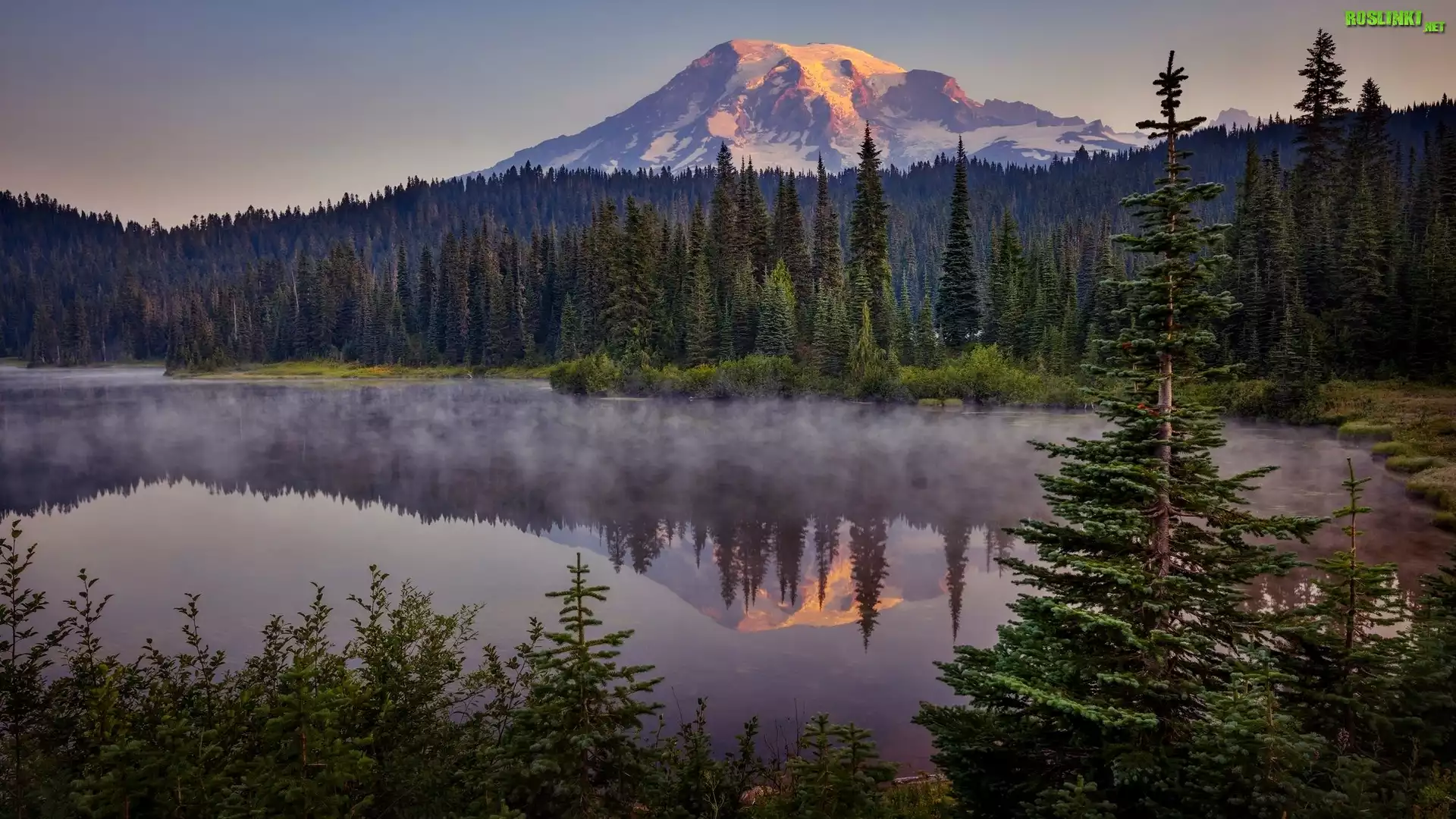 Park Narodowy Mount Rainier, Jezioro Reflection Lakes, Góra, Szczyt Mount Rainier, Stan Waszyngton, Stany Zjednoczone, Las, Drzewa, Świerki, Mgła |
