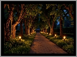 Latarnie, Drzewa, Noc, Park