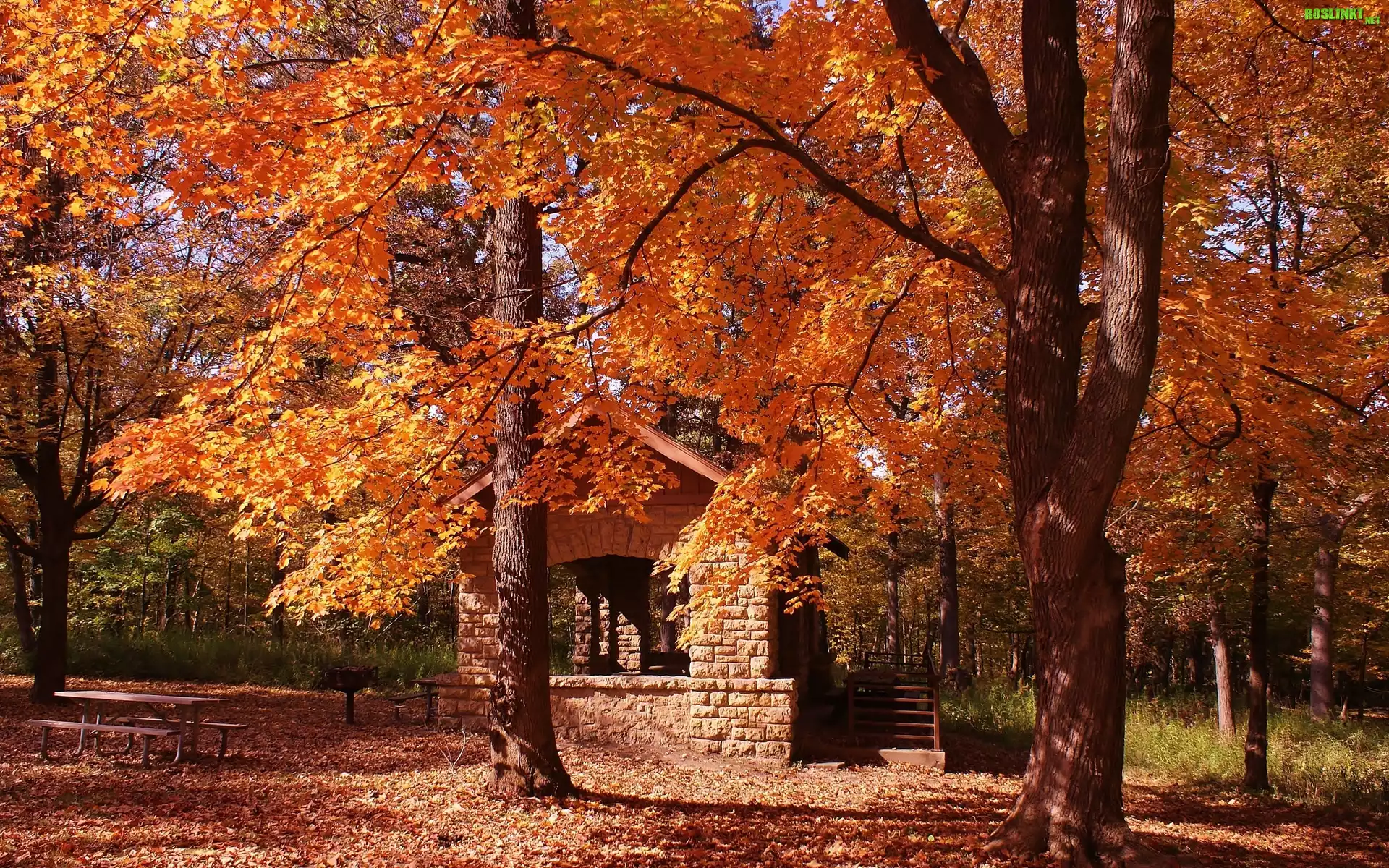 Rośliny: Park, Domek, Ławki, Liście, Jesień