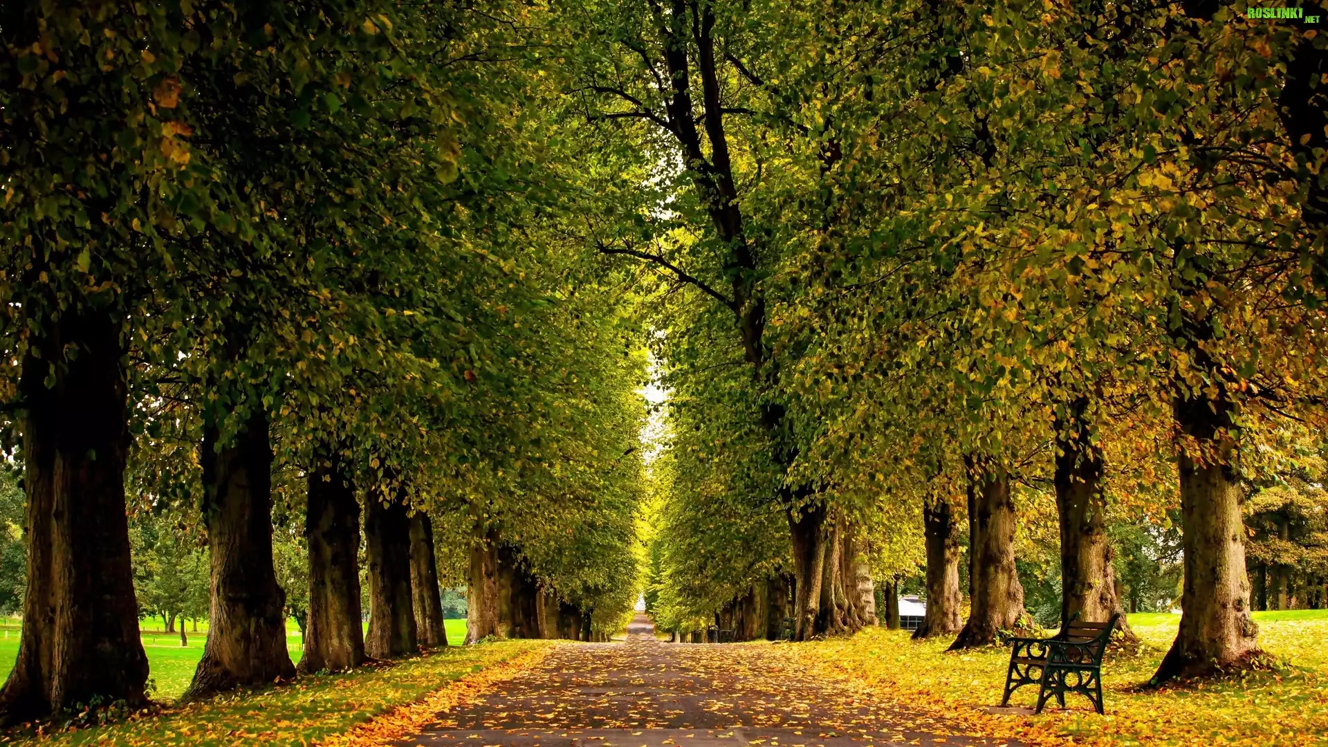 Rośliny: Park, Droga, Ławki, Drzewa, Liście, Jesień
