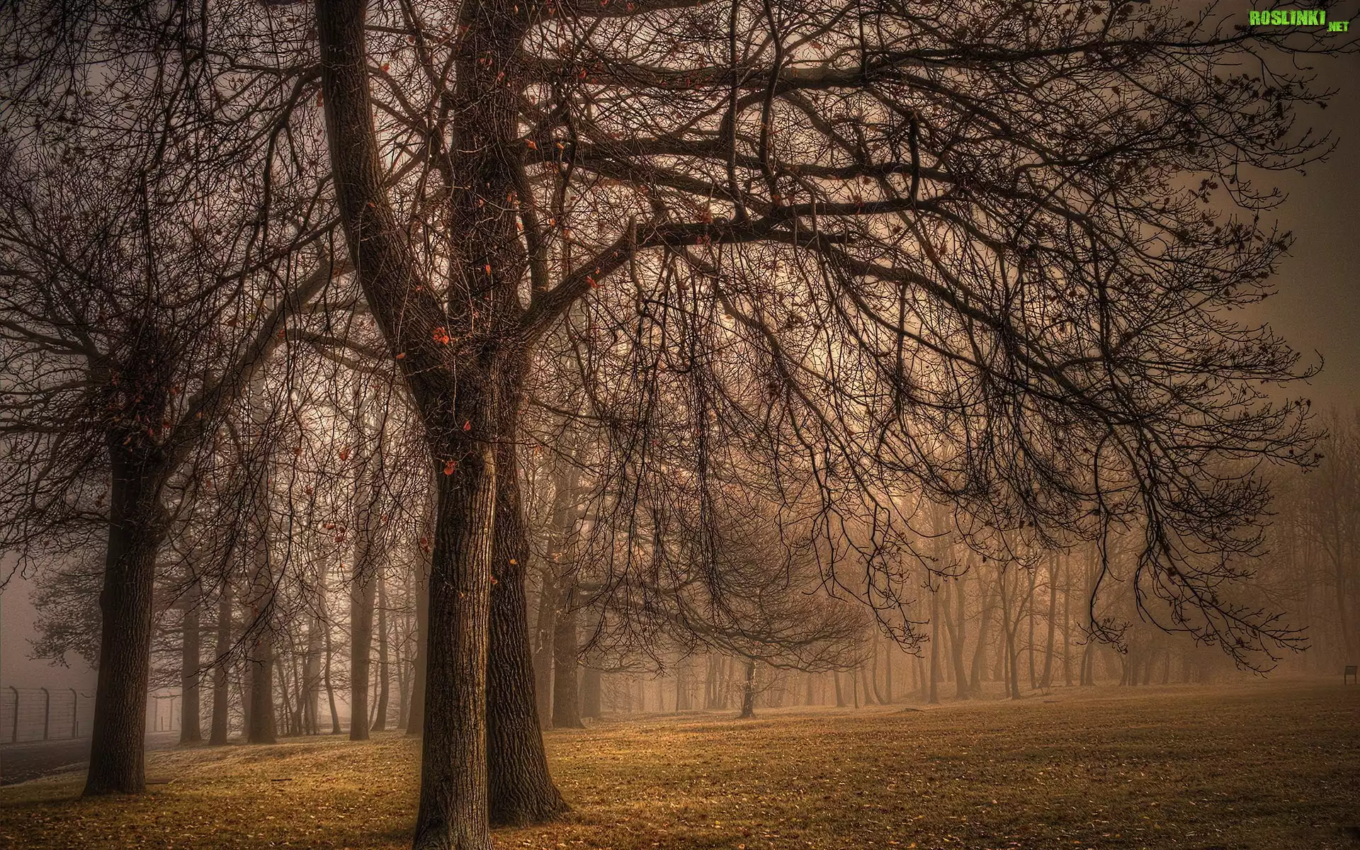 Rośliny: Park, Drzewa, Liście, Mgła, Jesień