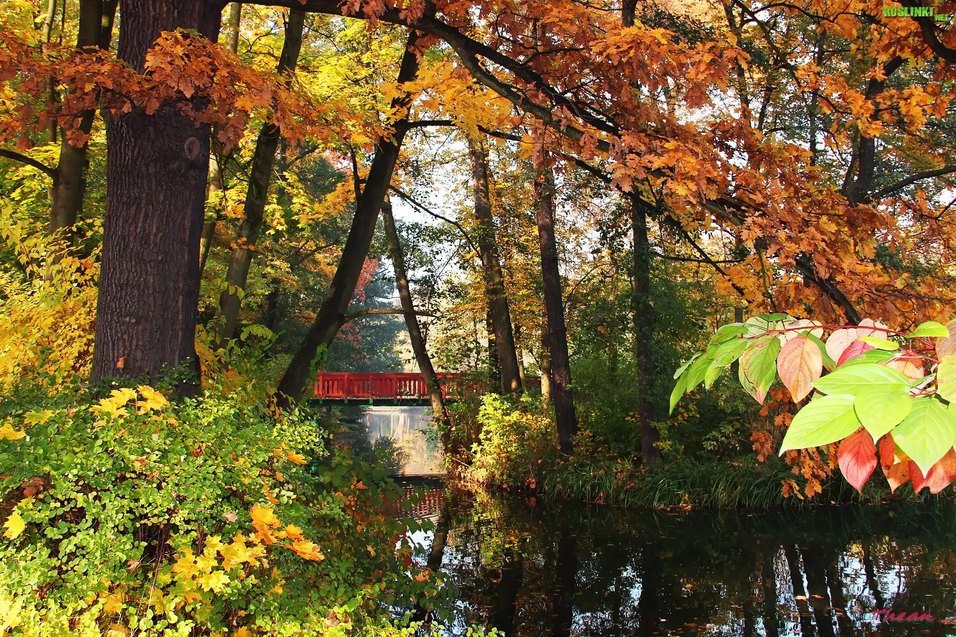 Rośliny: Park, Jesień, Kolorowe, Liście, Most, Jezoro