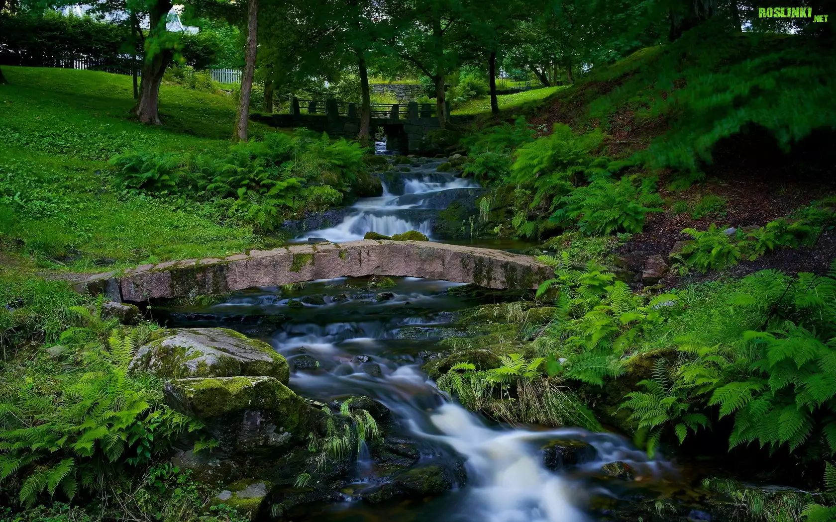 Park, Rzeczka, Paprocie, Mostek, Drzewa