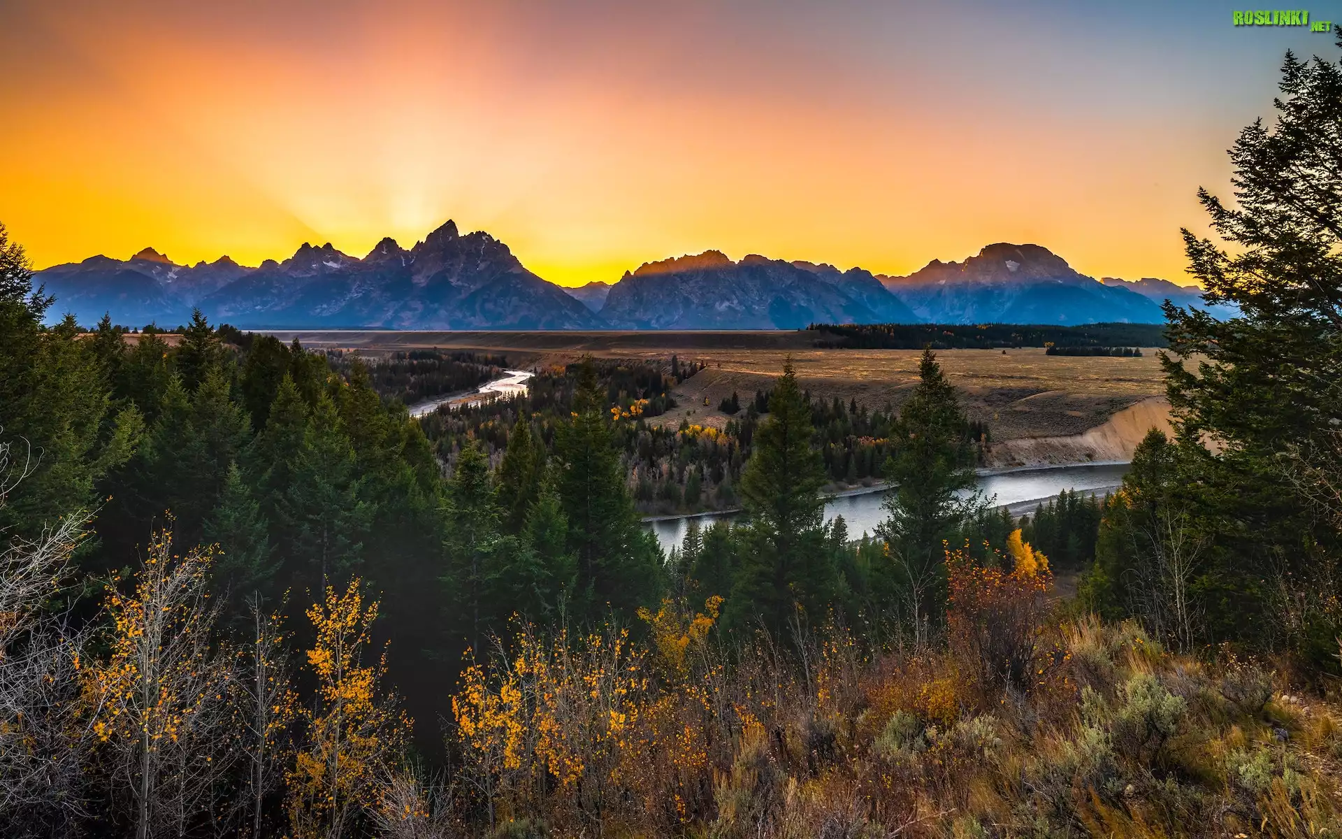 Park Narodowy Grand Teton, Góry, Teton Range, Las, Drzewa, Rzeka, Snake River, Promienie słońca, Stan Wyoming, Stany Zjednoczone |