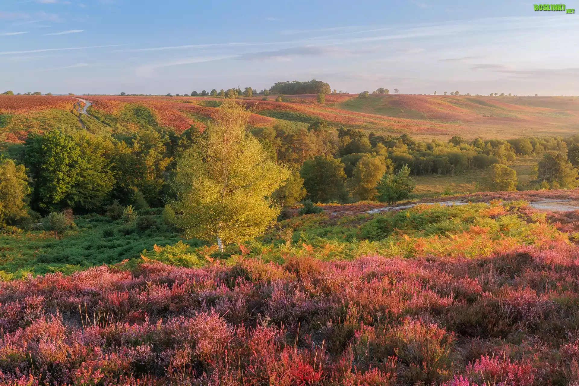 Rośliny: Wzgórza, Wrzosy, Wrzosowisko, Drzewa, Mgła, Poranek, Park Narodowy New Forest, Anglia