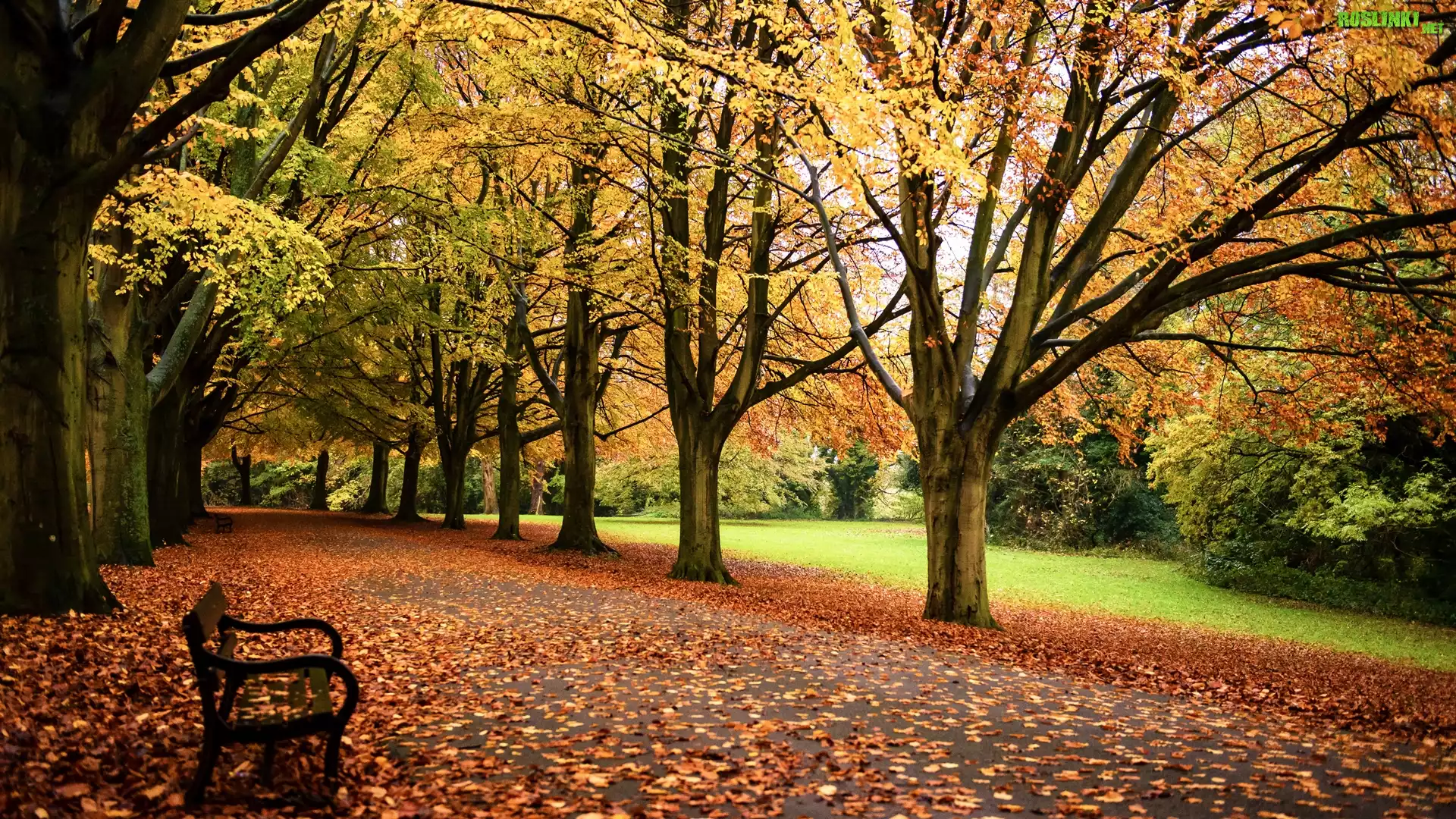 Rośliny: Park, Ławka, Drzewa, Jesień, Opadłe, Liście