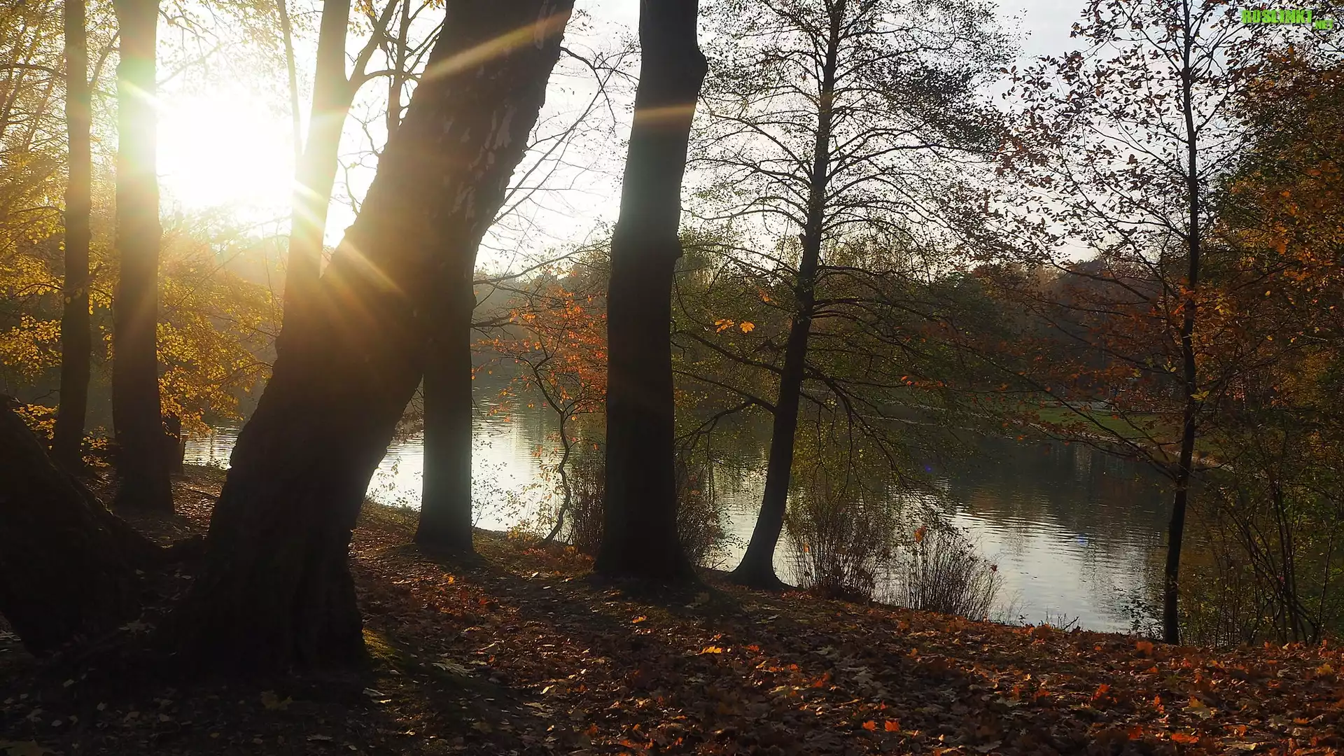 Rośliny: Park, Staw, Drzewa, Promienie słońca