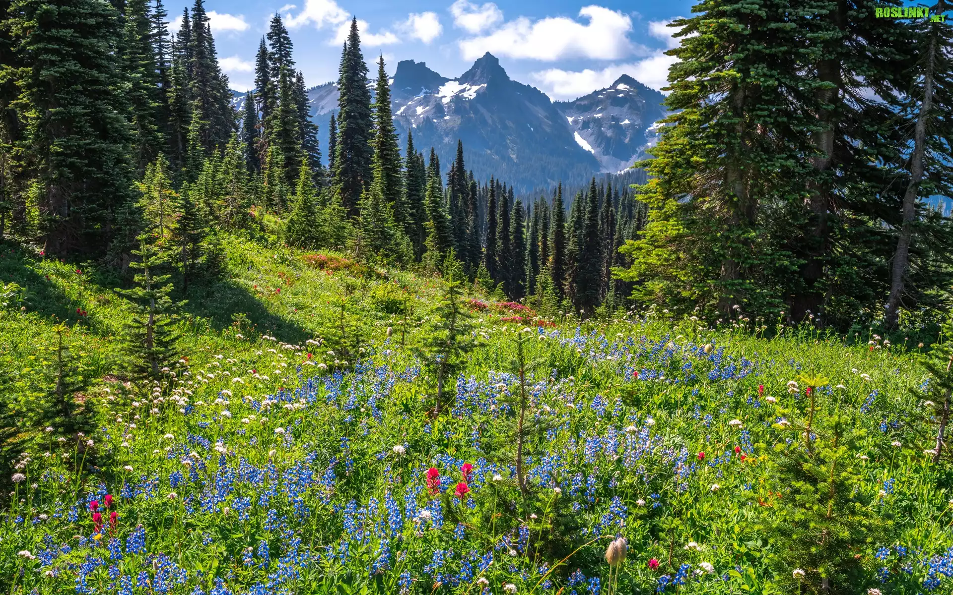 Rośliny: Park Narodowy Mount Rainier, Góry, Drzewa, Łąka, Kwiaty, Chmury, Stan Waszyngton, Stany Zjednoczone
