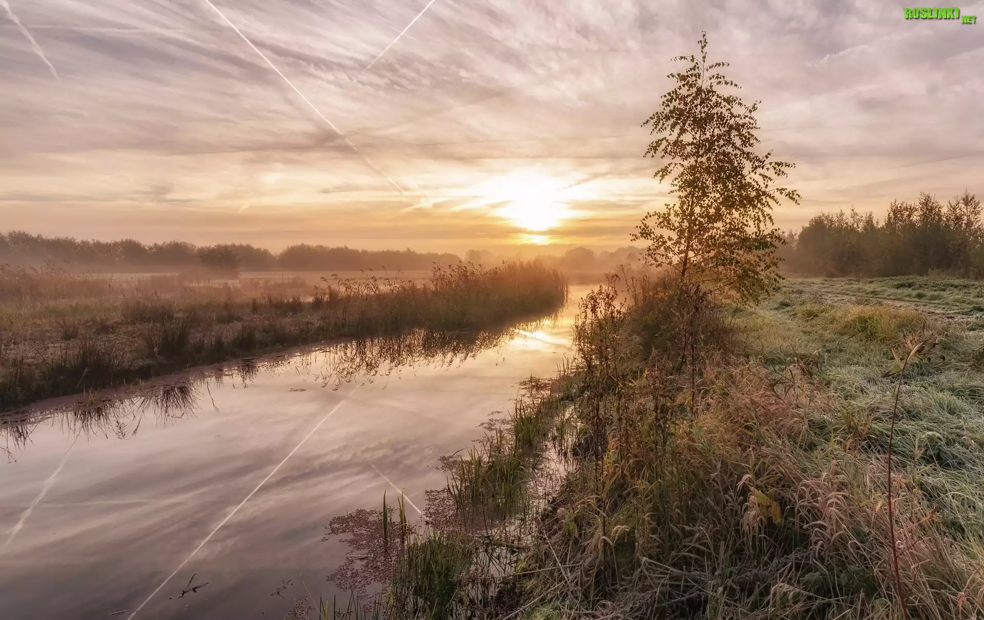 Rośliny: Rzeka, Drzewo, Mgła, Wschód słońca, Park przyrody De Schammer, Prowincja Ultrecht, Holandia