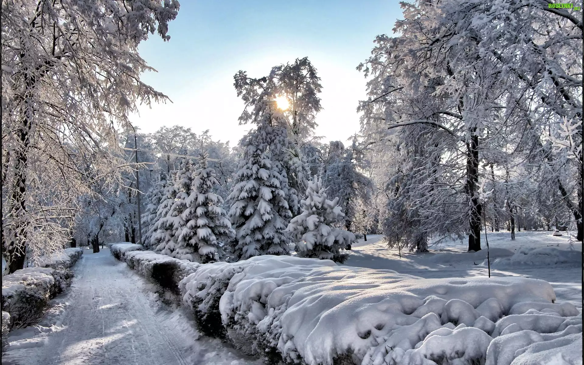 Rośliny: Park, Alejki, Drzewa, Promienie, Słońca, Zima