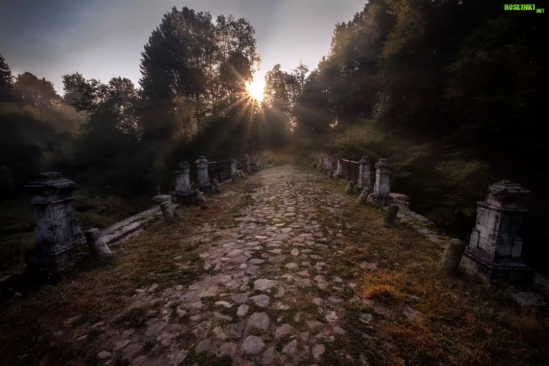 Rośliny: Park, Droga, Drzewa, Promienie słońca, Drzewa