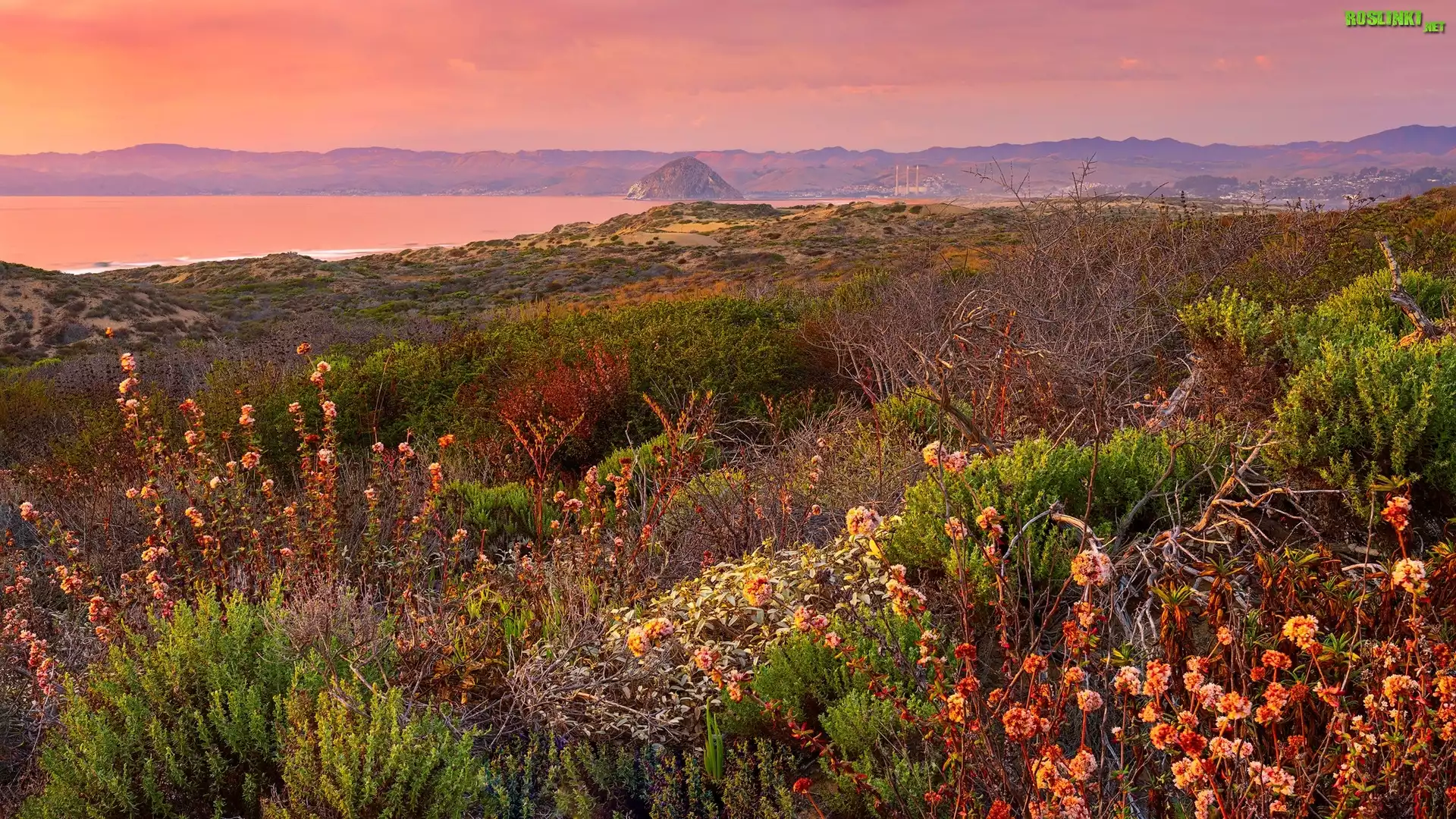 Stany Zjednoczone, Kalifornia, Park Stanowy Montana de Oro, Zachód słońca, Wzgórza, Krzewy, Roślinność |