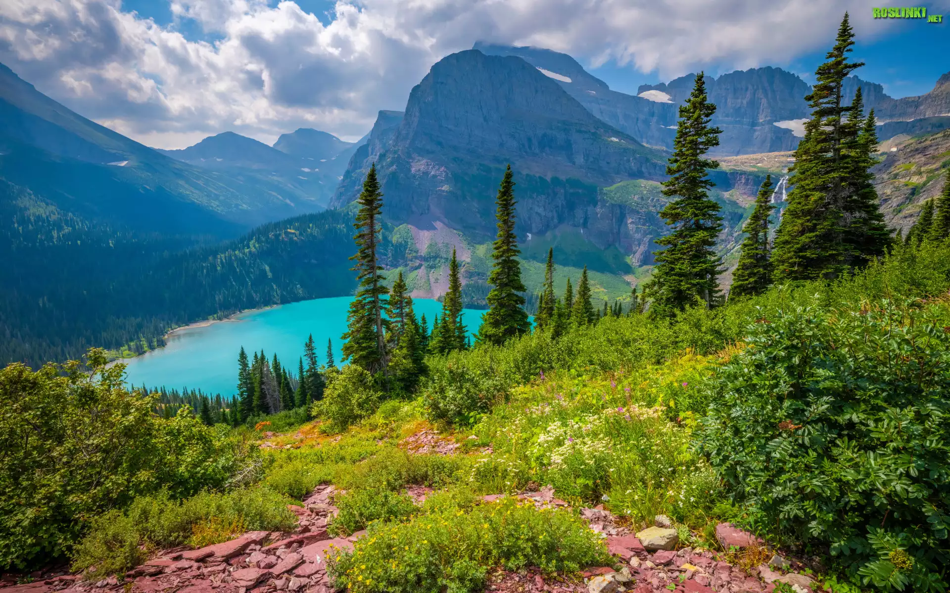 Rośliny: Park Narodowy Glacier, Góry, Jezioro, Grinnell Lake, Drzewa, Zieleń, Chmury, Stany Zjednoczone