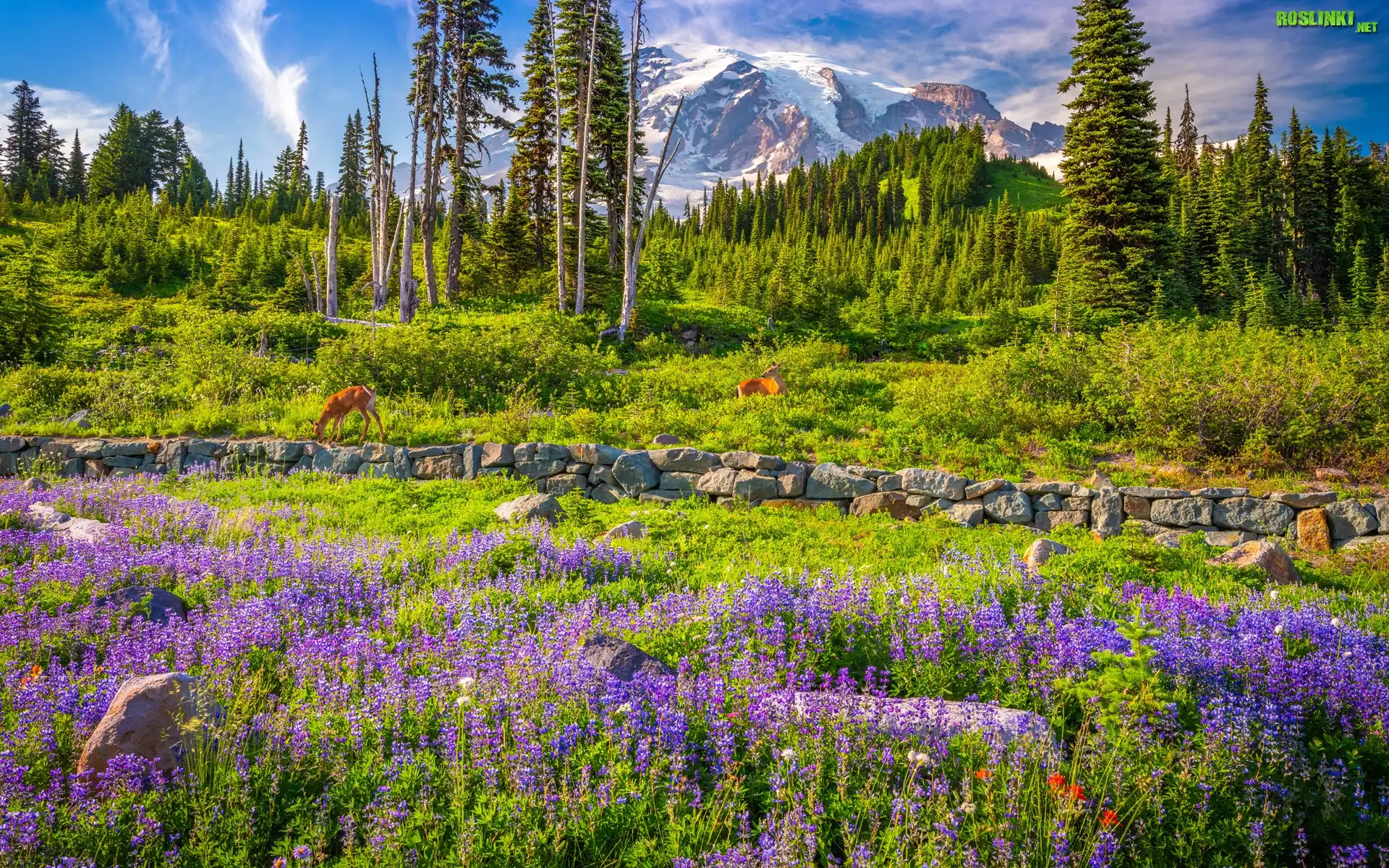 Park Narodowy Mount Rainier, Góry, Stratowulkan Mount Rainier, Drzewa, Łąka, Kwiaty, Sarny, Stan Waszyngton, Stany Zjednoczone |