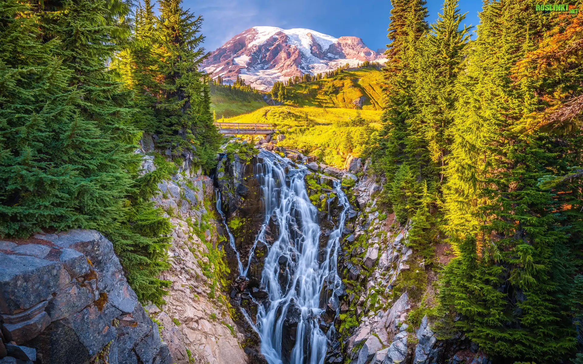 Park Narodowy Mount Rainier, Góry, Stratowulkan Mount Rainier, Wodospad, Myrtle Falls, Drzewa, Stan Waszyngton, Stany Zjednoczone |