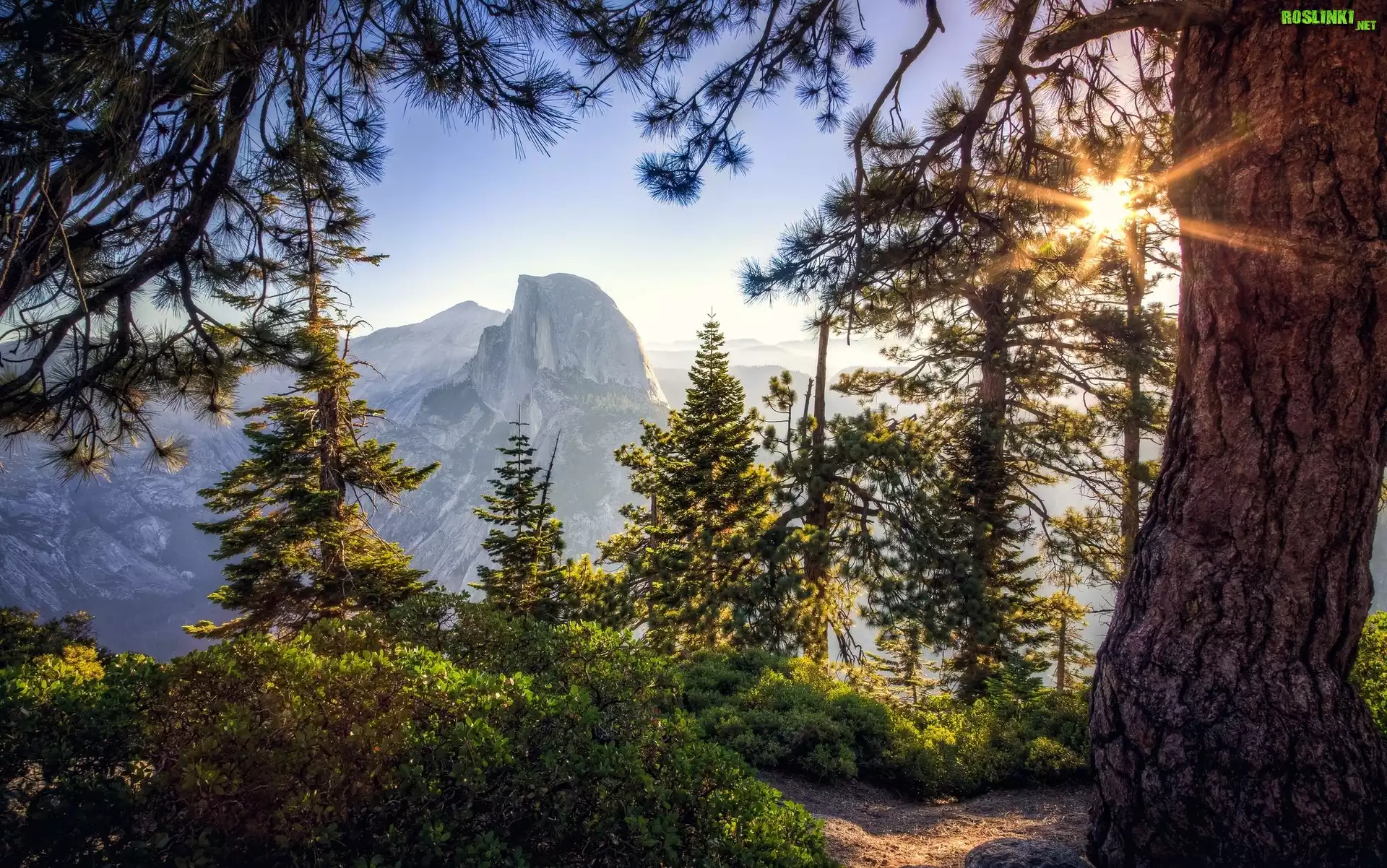 Stany Zjednoczone, Stan Kalifornia, Park Narodowy Yosemite, Szczyt Half Dome, Wschód słońca, Drzewa, Góry |