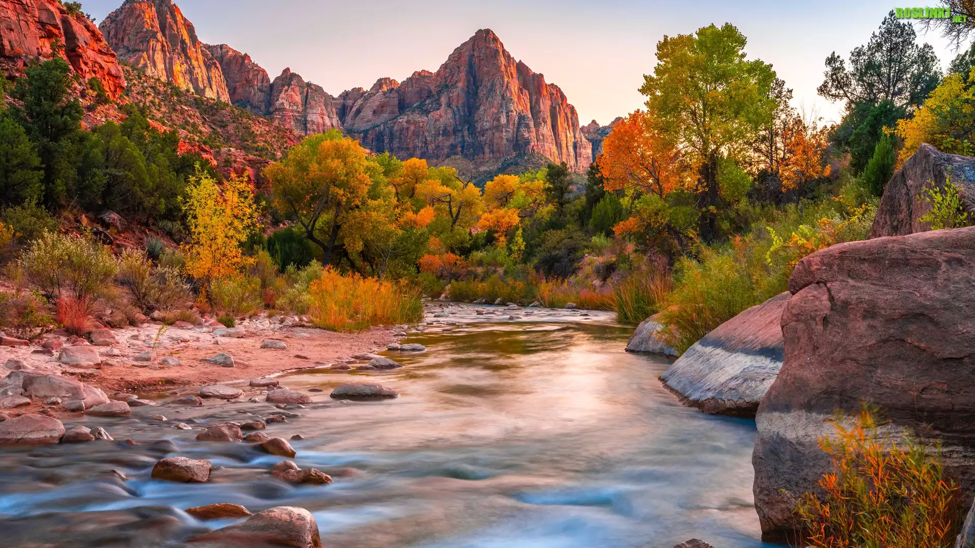 Park Narodowy Zion, Góry Watchman, Rzeka, Virgin River, Kamienie, Drzewa, Jesień, Stan Utah, Stany Zjednoczone |