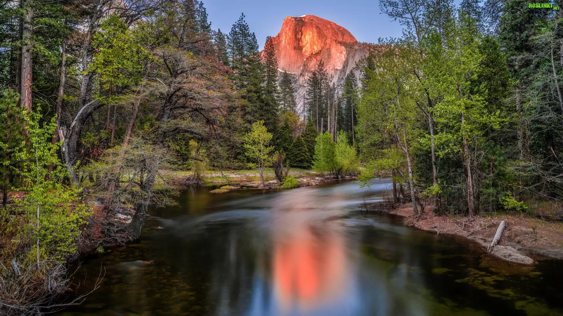 Park Narodowy Yosemite, Góry, Szczyt Half Dome, Rzeka, Merced River, Drzewa, Las, Kalifornia, Stany Zjednoczone |