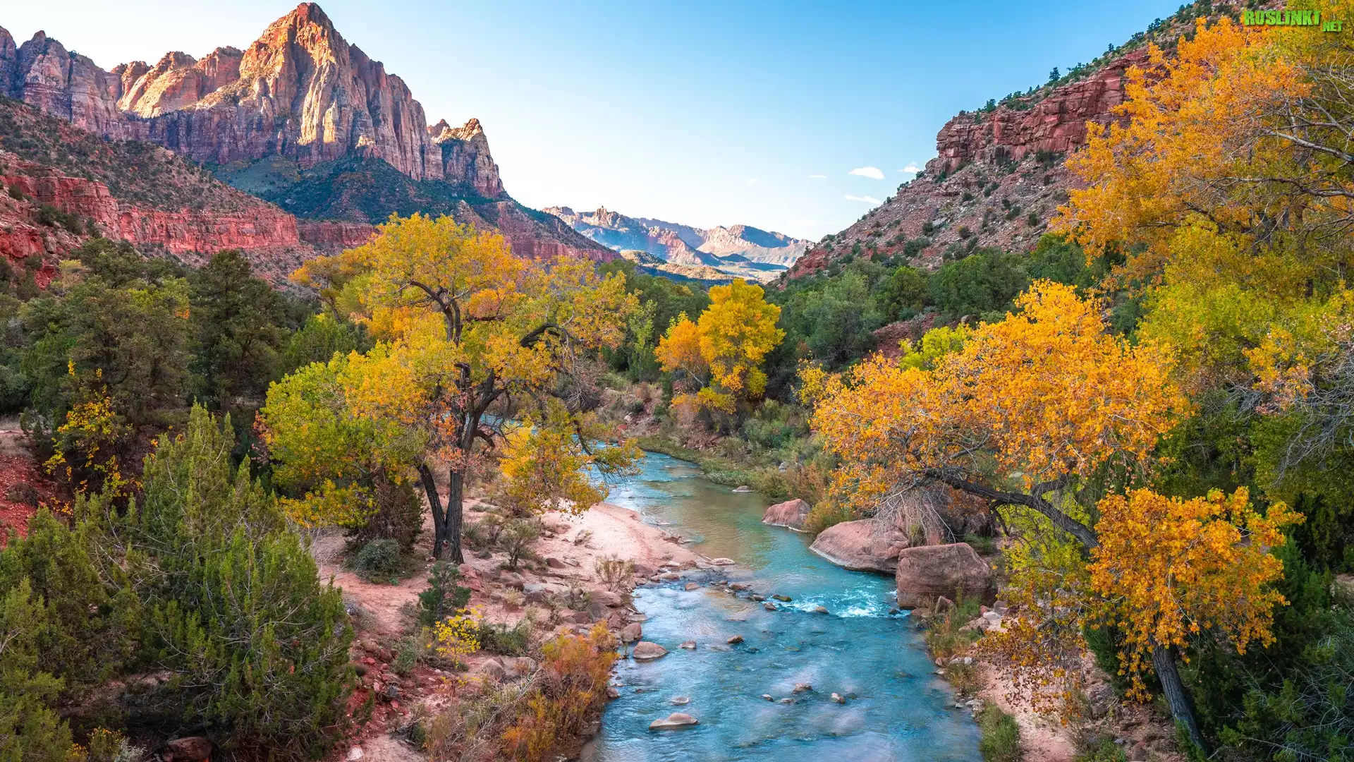 Stany Zjednoczone, Stan Utah, Park Narodowy Zion, Góry Watchman, Rzeka, Virgin River, Kamienie, Drzewa |