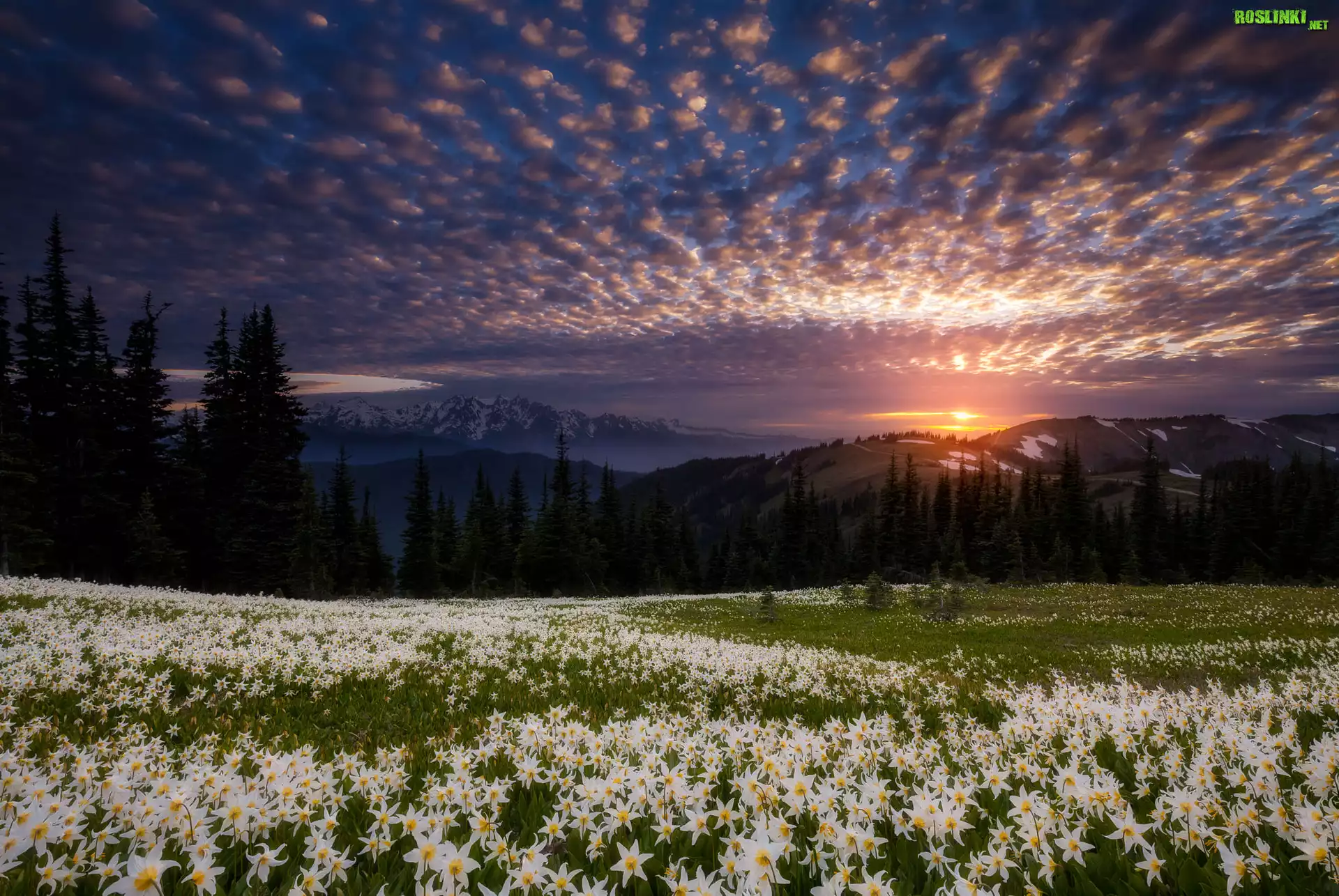 Stany Zjednoczone, Stan Waszyngton, Park Narodowy Olympic, Zachód słońca, Góry, Lasy, Drzewa, Kwiaty, Psizęby |