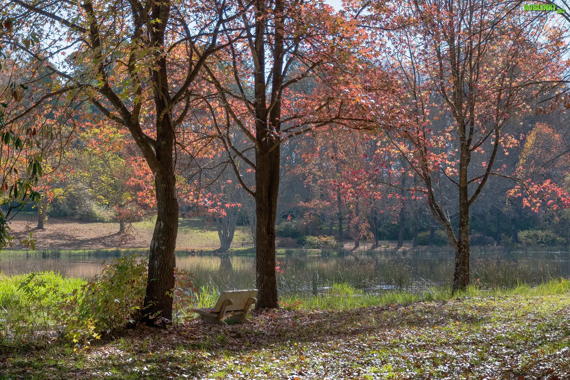 Rośliny: Jesień, Park, Staw, Ławka, Drzewa