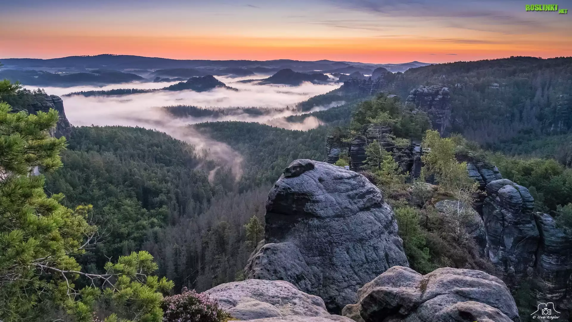 Park Narodowy Saskiej Szwajcarii, Skały, Góry Połabskie, Lasy, Drzewa, Wschód słońca, Mgła, Niemcy |