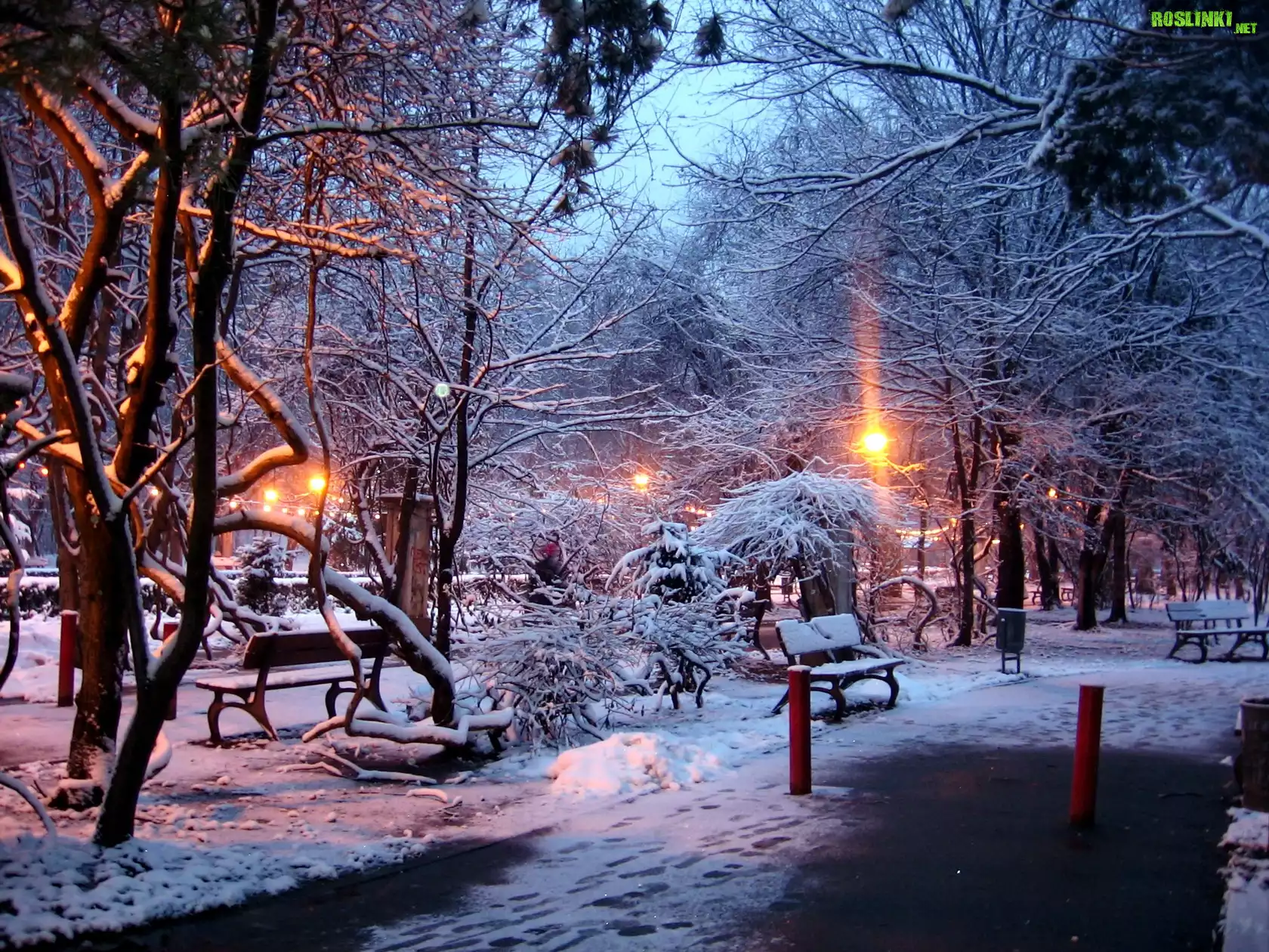Rośliny: Park, Drzewa, Ławki, Przebijające, Światło, Zima