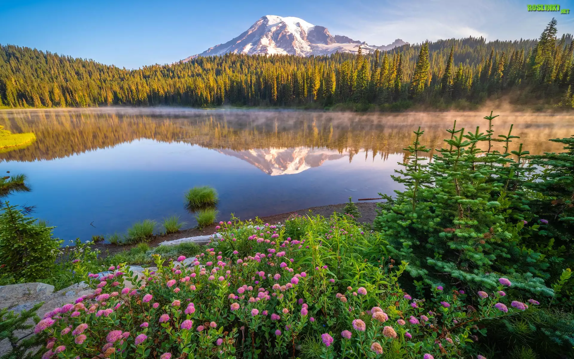 Park Narodowy Mount Rainier, Góry, Stratowulkan Mount Rainier, Drzewa, Świerki, Kwiaty, Jezioro, Odbicie, Stan Waszyngton, Stany Zjednoczone |