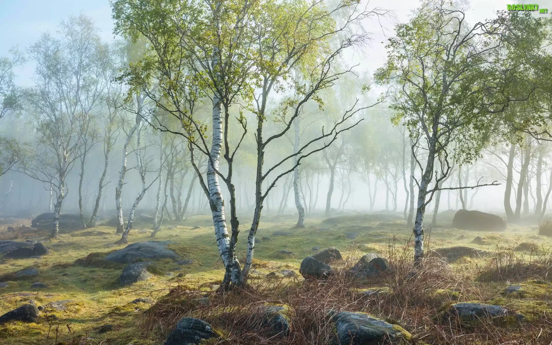 Rośliny: Wiosna, Drzewa, Brzozy, Kamienie, Mgła, Park Narodowy Peak District, Hrabstwo Derbyshire, Anglia