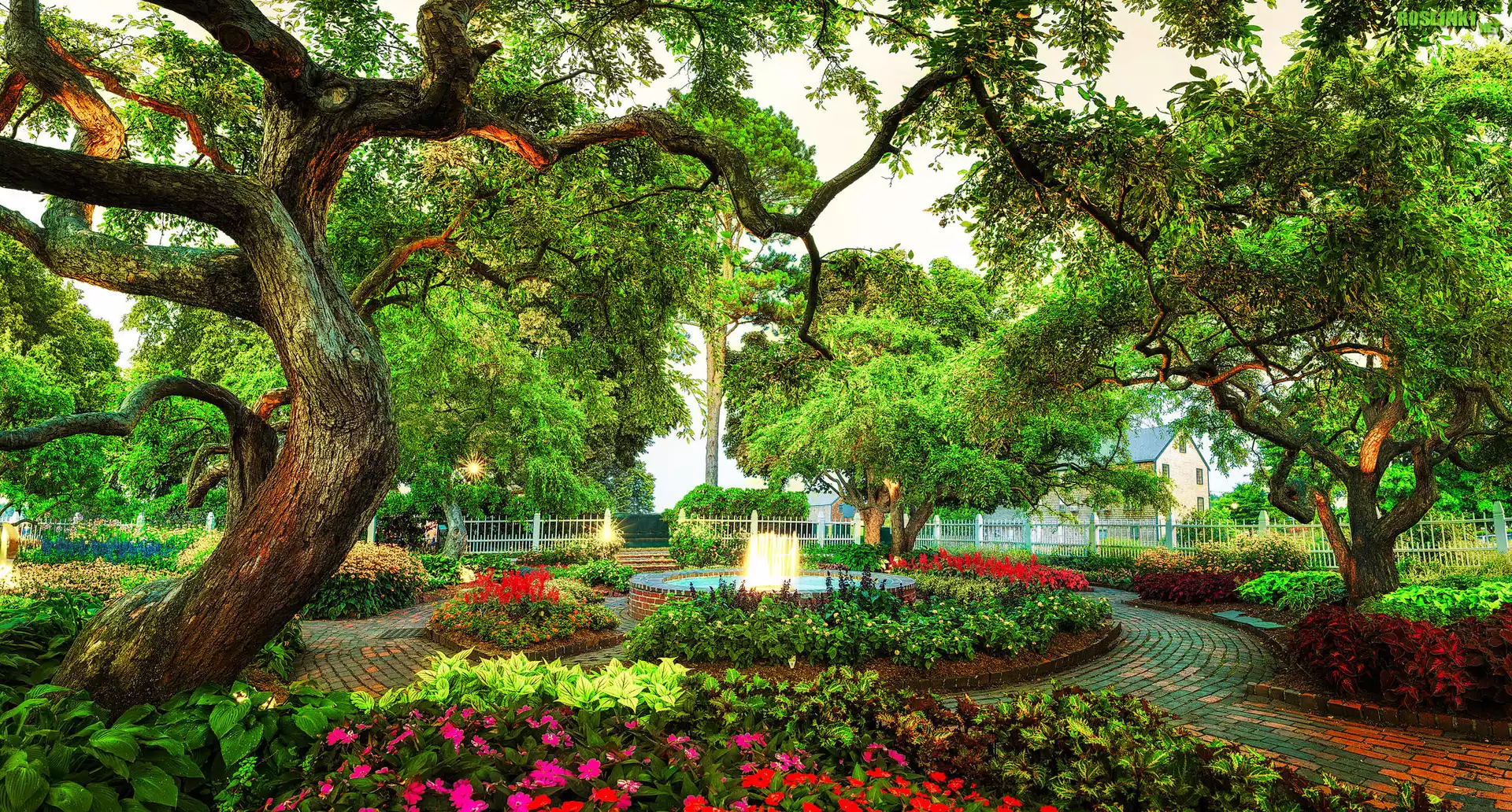 Park, Prescott Park, Wiosna, Kwiaty, Drzewa, Fontanna, Portsmouth, Stan New Hampshire, Stany Zjednoczone |