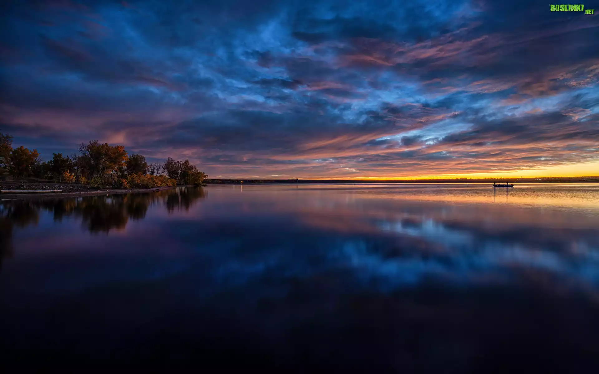 Stany Zjednoczone, Stan Kolorado, Wschód słońca, Chatfield State Park, Jezioro, Chatfield Lake, Chmury, Drzewa |