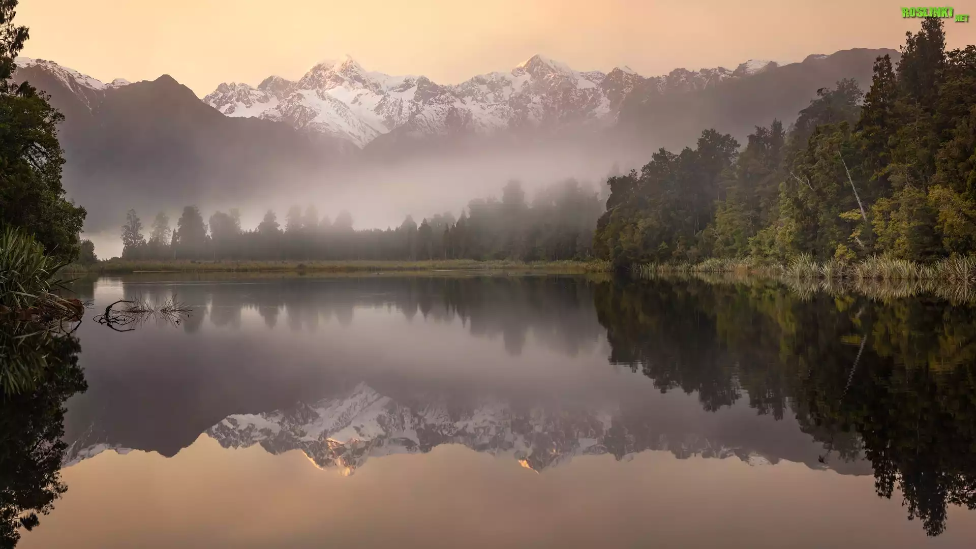Park Narodowy Góry Cooka, Góry, Drzewa, Mgła, Odbicie, Jezioro Matheson, Góra Cooka, Nowa Zelandia, Wschód słońca |