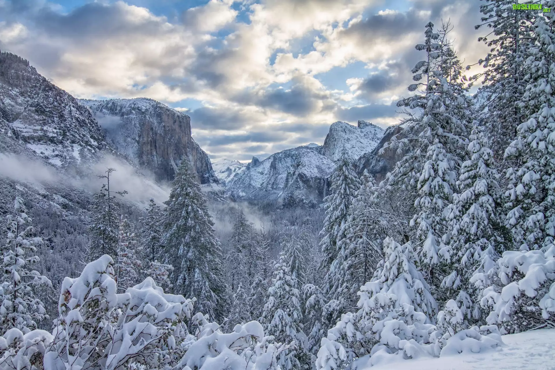 Park Narodowy Yosemite, Zima, Góry Sierra Nevada, Drzewa, Chmury, Stan Kalifornia, Stany Zjednoczone |