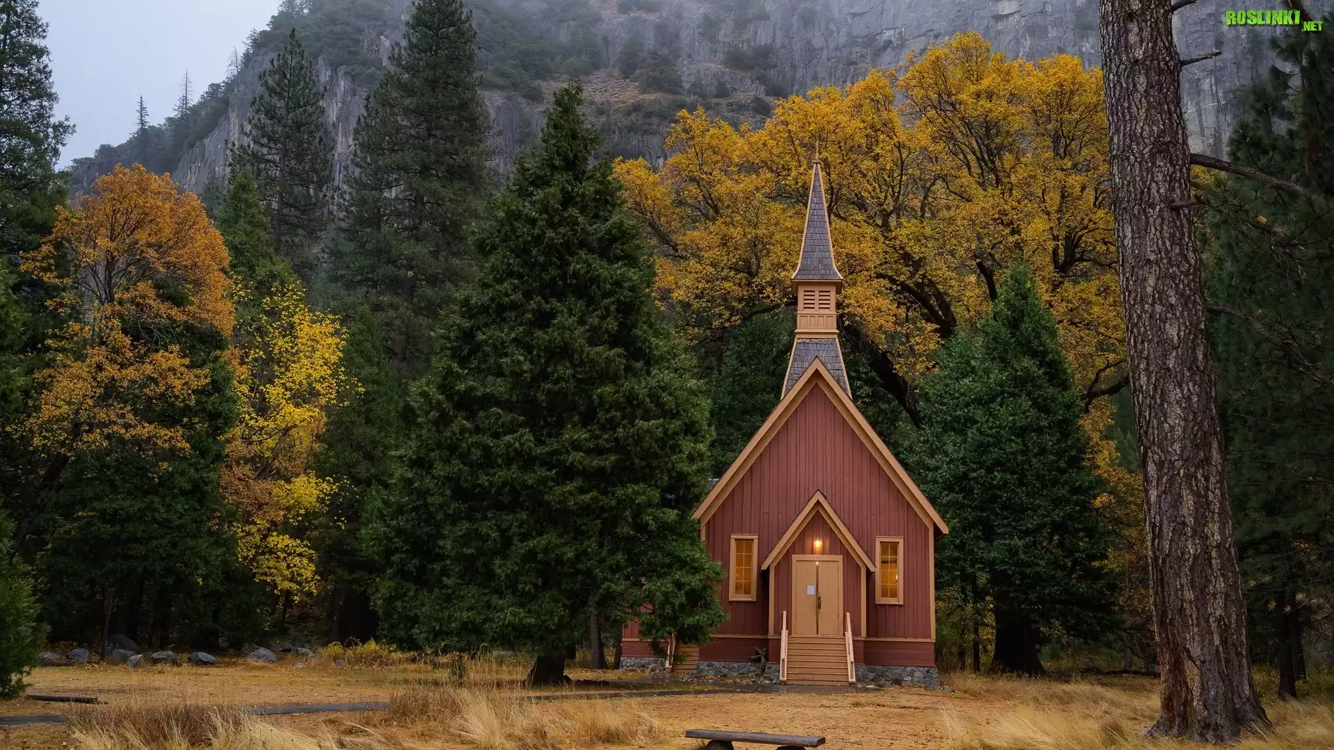 Zima, Drzewa, Kościółek, Kaplica, Las, Park Narodowy Yosemite, Stan Kalifornia, Stany Zjednoczone |