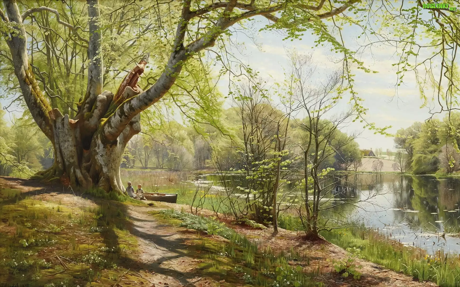Obraz, Peder Monsted, Rzeka, Drzewo, Łódka, Ścieżka