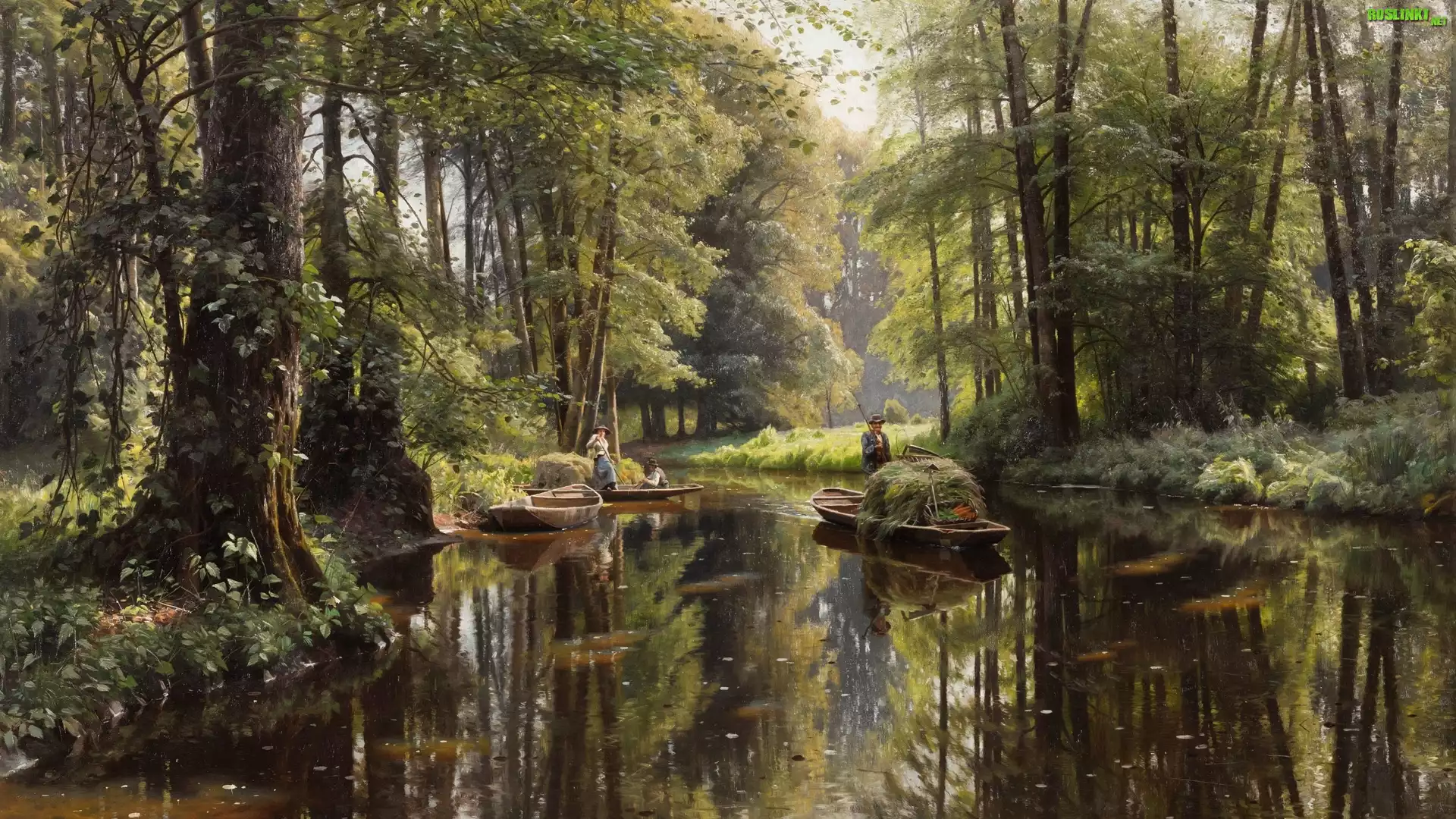 Rośliny: Obraz, Malarstwo, Peder Monsted, Rzeka, Las, Drzewa, Ludzie, Łódki, Szprewald 1913