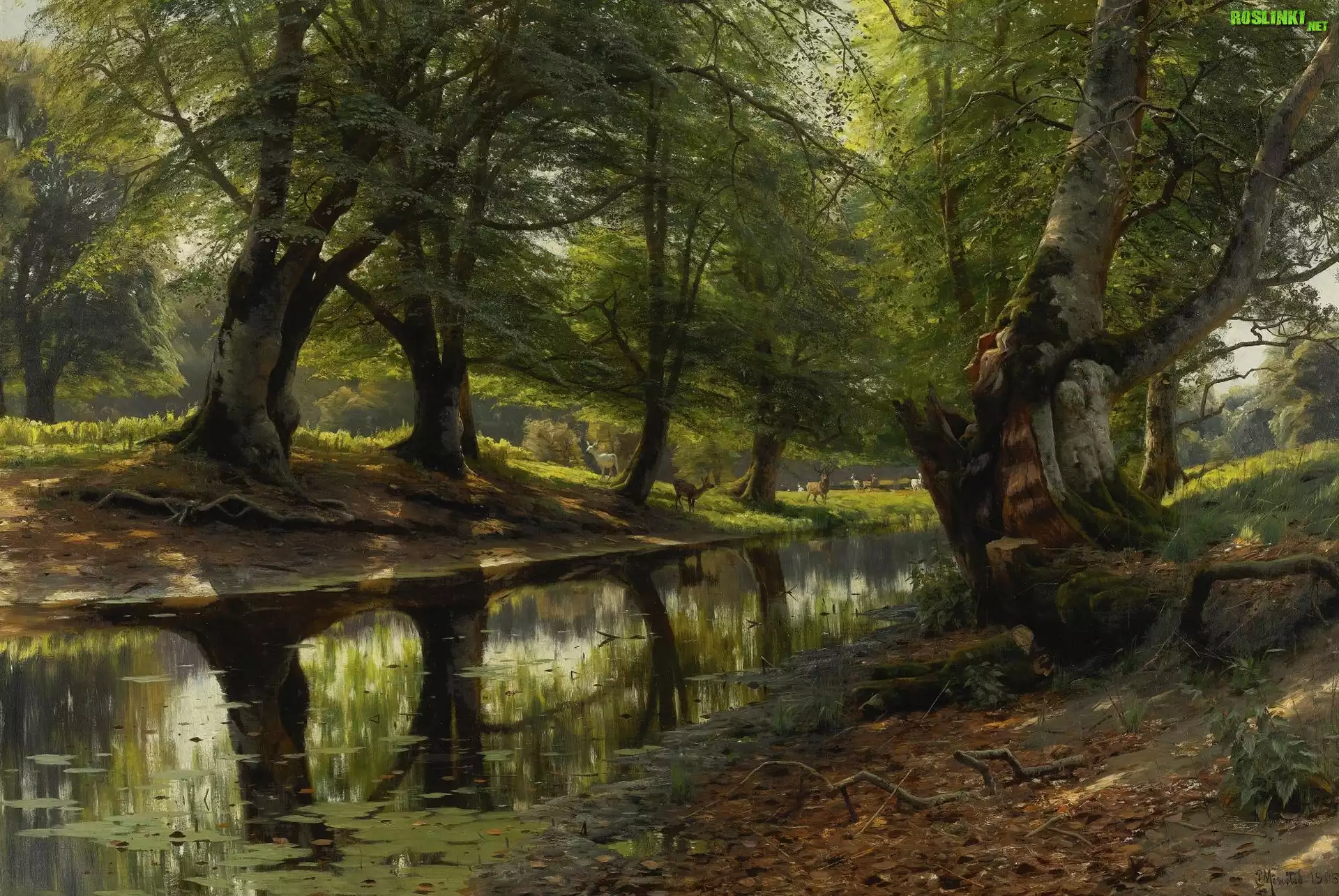 Rośliny: Malarstwo, Peder Monsted, Drzewa, Koryto, Rzeka, Jelenie, Sarny