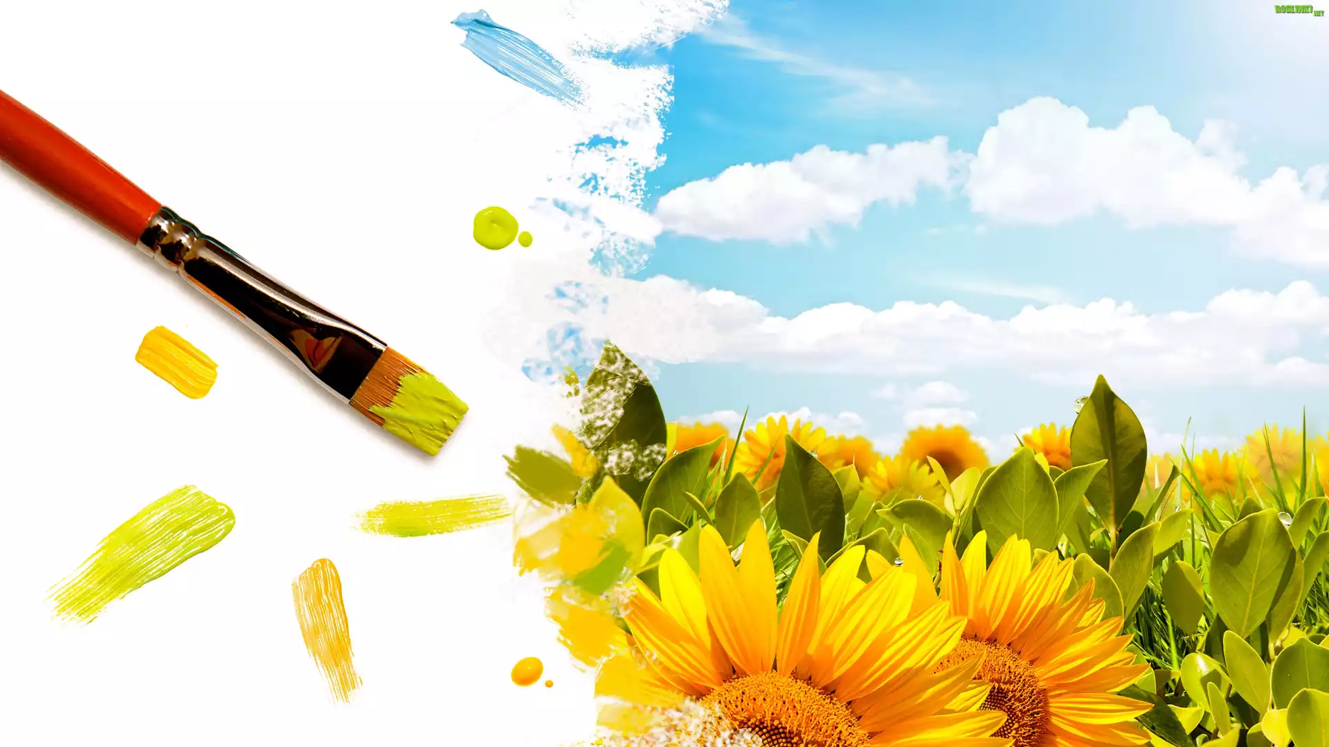 Rośliny: Pędzel, Farby, Słoneczniki, Niebo, 2D