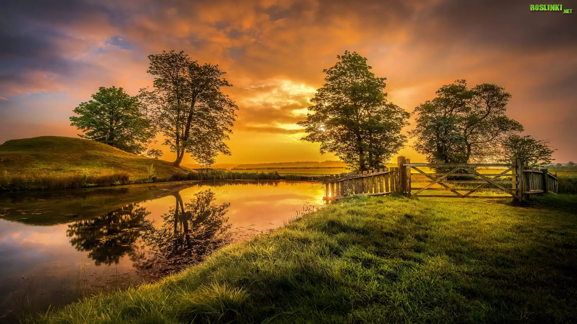 Anglia, Hrabstwo Cambridgeshire, Miasto Peterborough, Posiadłość Lyveden New Bield, Staw, Wschód Słońca, Drzewa, Ogrodzenie |