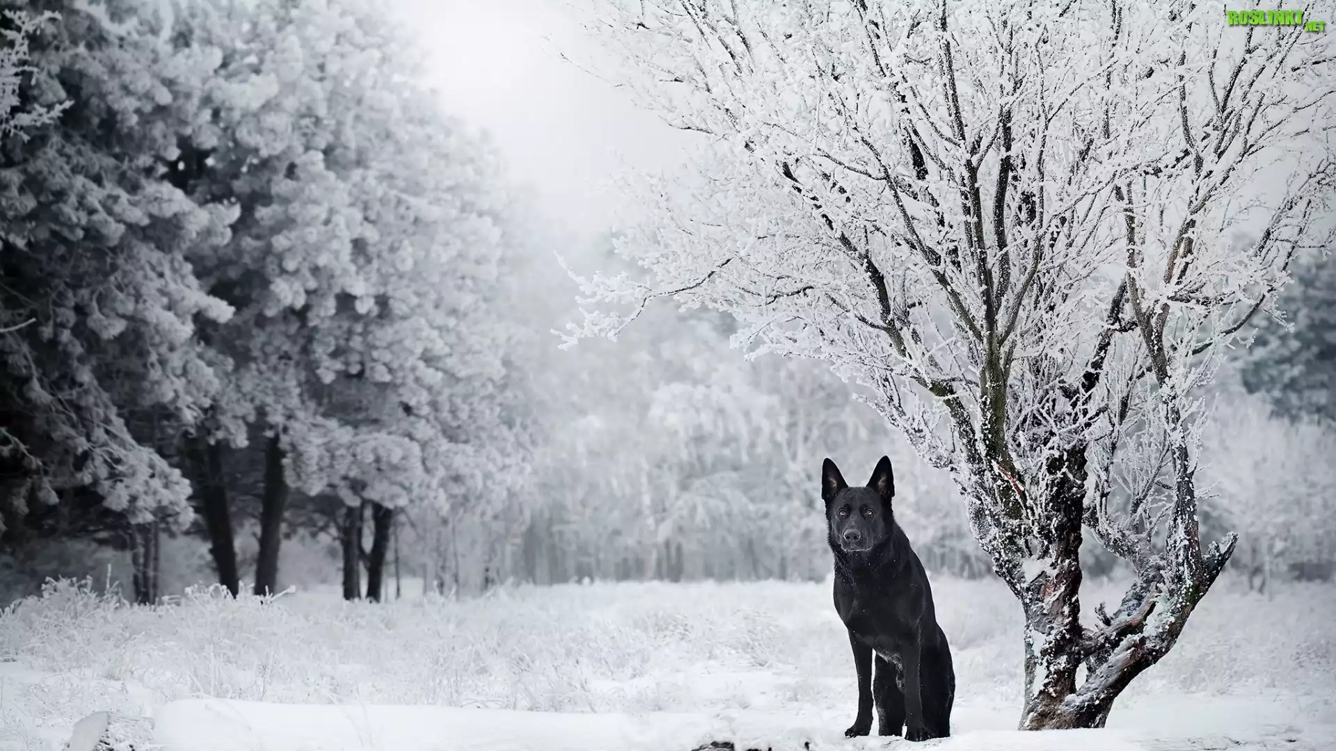 Pies, Czarny owczarek niemiecki, Zima, Drzewa