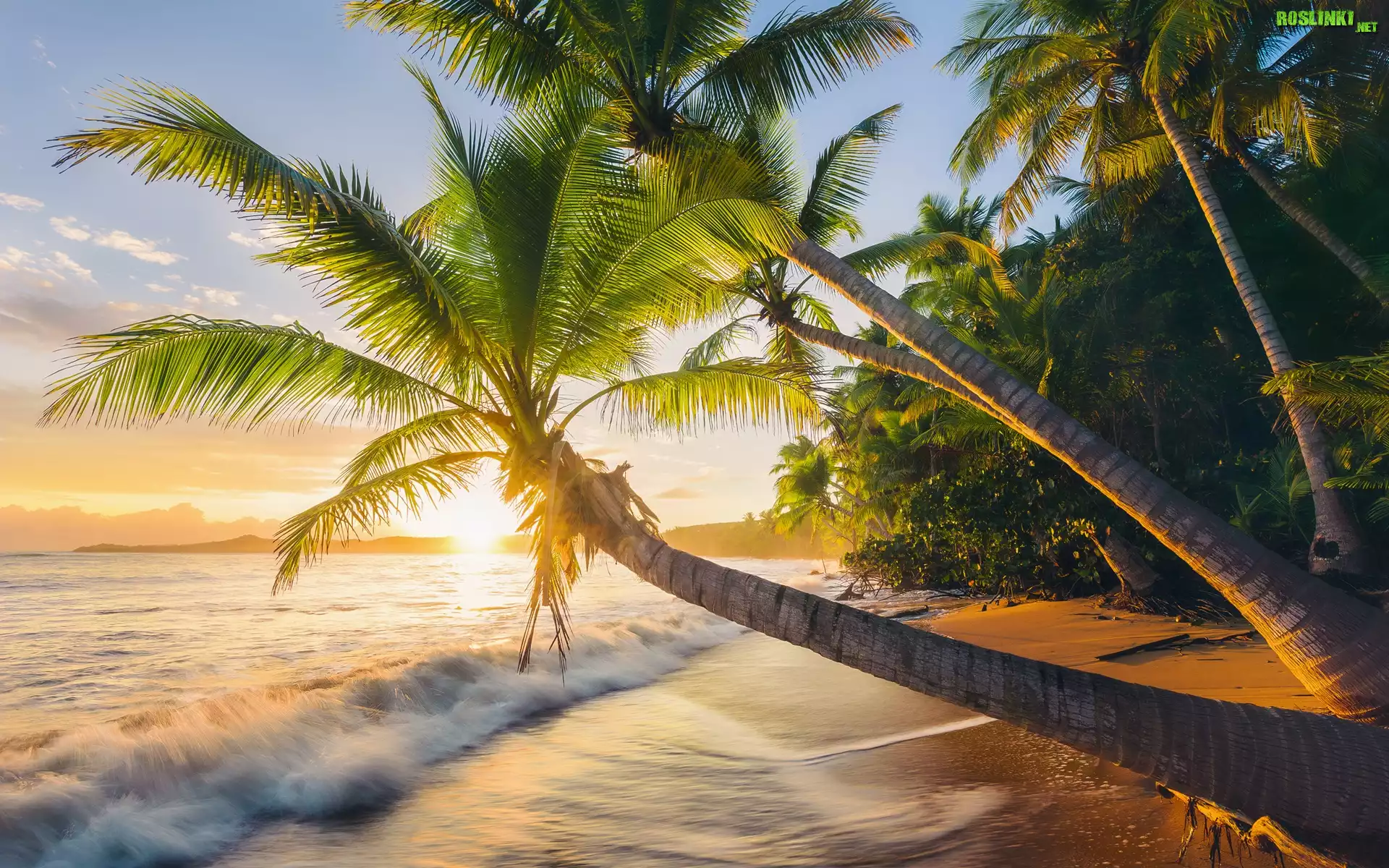 Rośliny: Morze, Fale, Plaża, Buccaneer Beach, Wschód słońca, Palmy, Portoryko, Puerto Rico