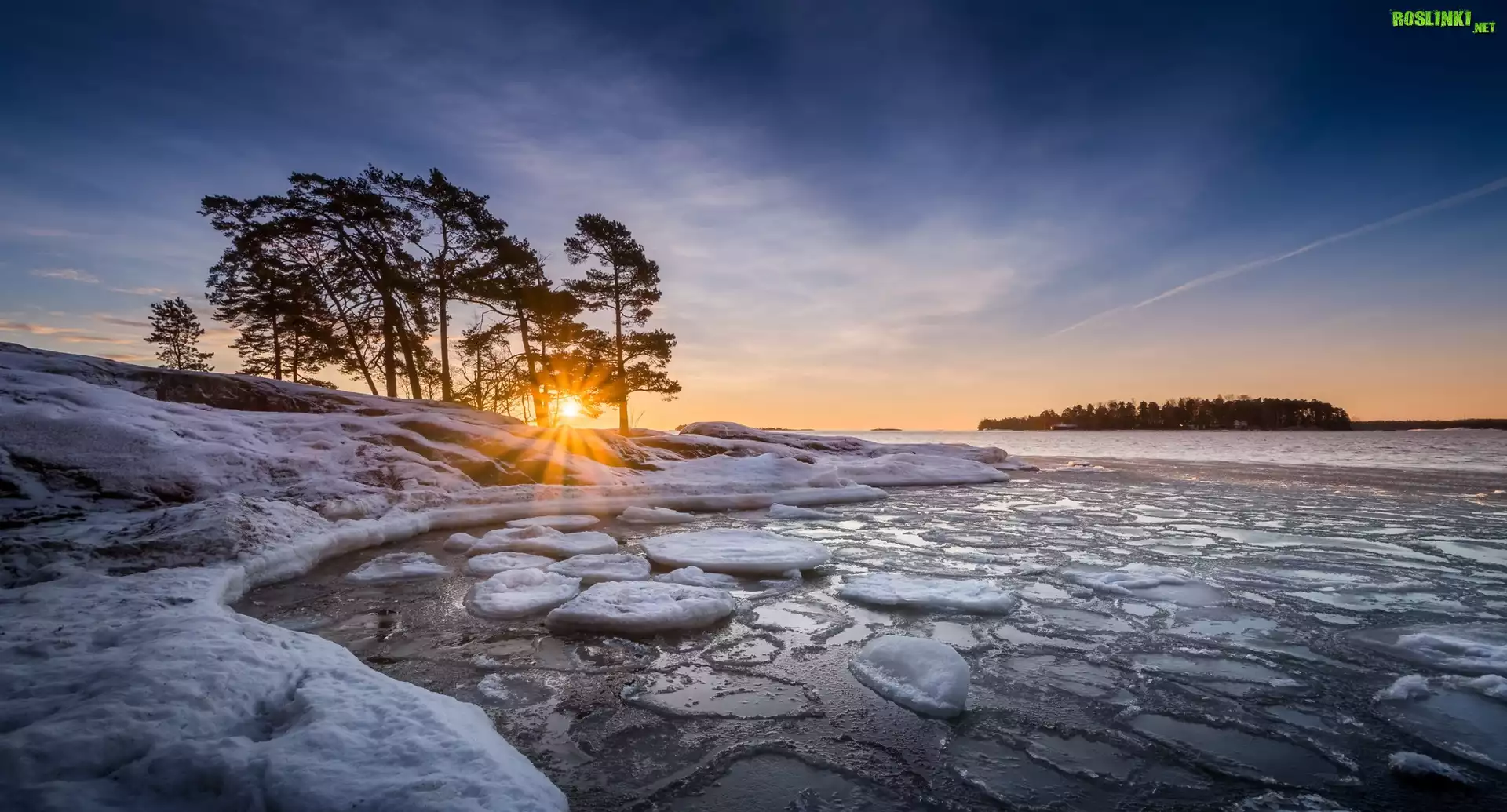 Finlandia, Helsinki, Półwysep Kallviksudden, Plaża Kallahdenniemi, Zatoka, Morze, Zima, Promienie słońca, Zachód słońca, Drzewa |