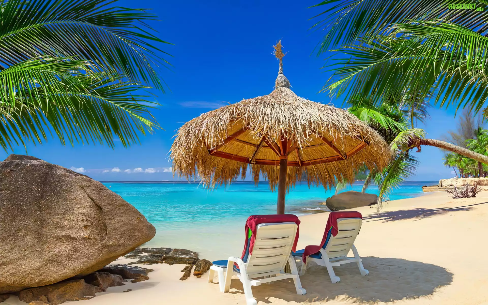 Rośliny: Morze, Plaża, Kamień, Leżaki, Palma