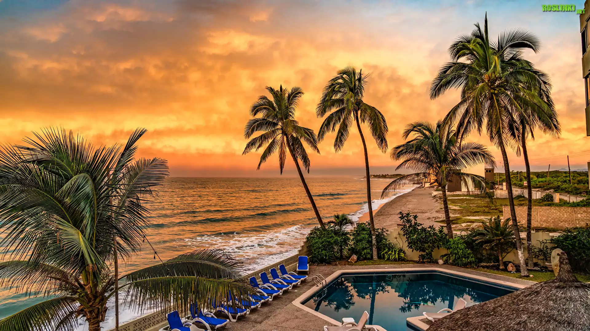 Rośliny: Meksyk, Mazatlan, Golden Beach, Palmy, Basen, Leżaki, Plaża, Morze, Zachód słońca